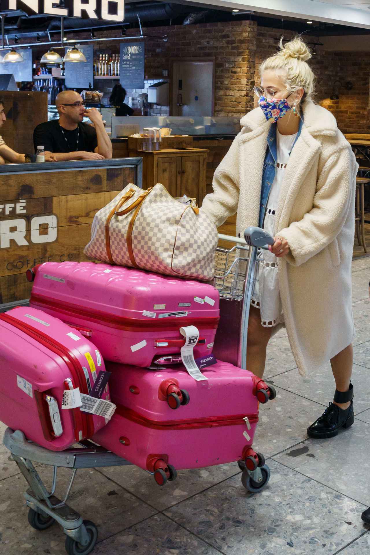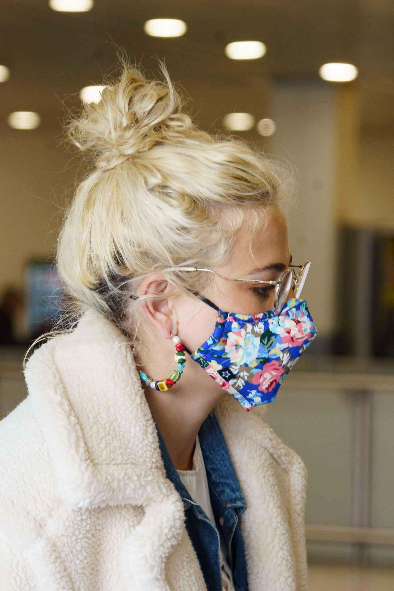 イギリス出身の人気シンガーピクシー・ロットは、空港での移動中にコロナ対策として、フラワープリントのマスクを着用。
