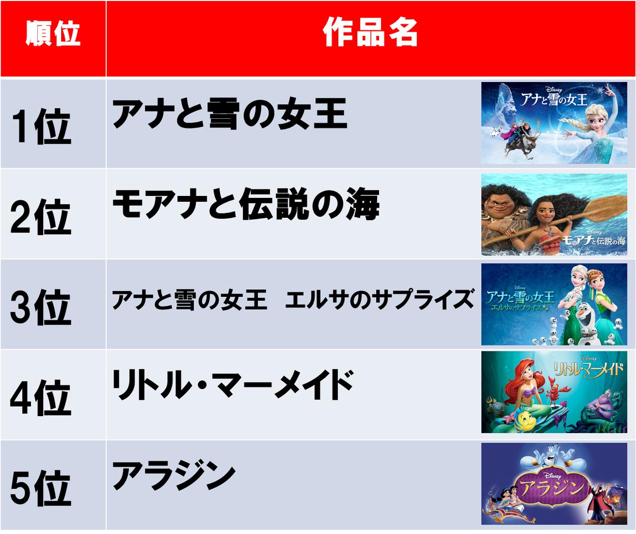 第4位には『リトル・マーメイド』、第5位にはディズニーデラックスにて実写版も配信開始となったアニメ『アラジン』がランクインした。アニメーション版と実写版を見比べるのもおすすめ。