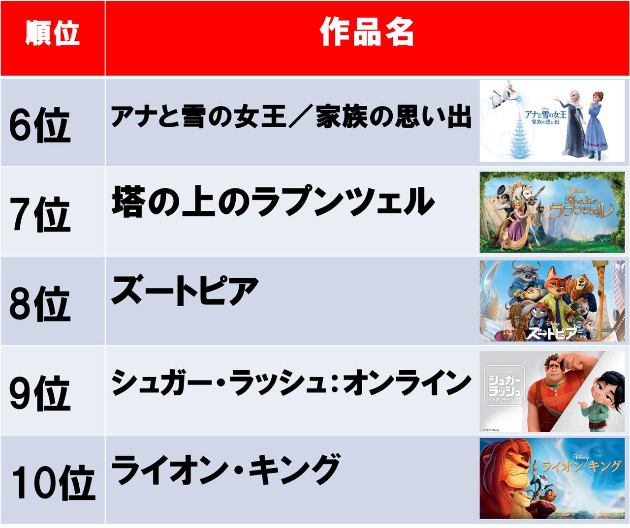 続いて6位に『アナと雪の女王/家族の思い出』と12位に『ラプンツェルのウェディング』といった、短編作品がランクインした。これも長編作品の“気になるその後”が描かれている上、長編本編とは一味違ったコミカルなミュージカルシーンも楽しめる作品となっており、人気作品の関連作品が見放題となっているディズニーデラックスならではの結果に。