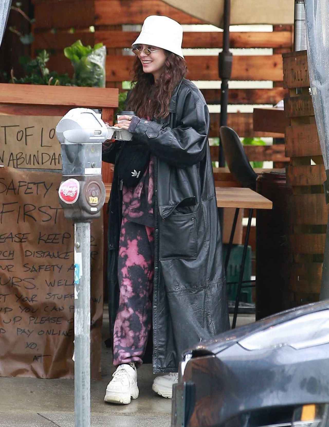 カジュアルな私服に定評がある人気女優のヴァネッサ・ハジェンズは、タイダイのセットアップにブラックのマキシ丈コートを羽織ってこなれて見せて。アディダスのウエストバッグを前掛けして、Naked Wolfeのプラットフォームスニーカーで旬なストリートスタイルの完成。