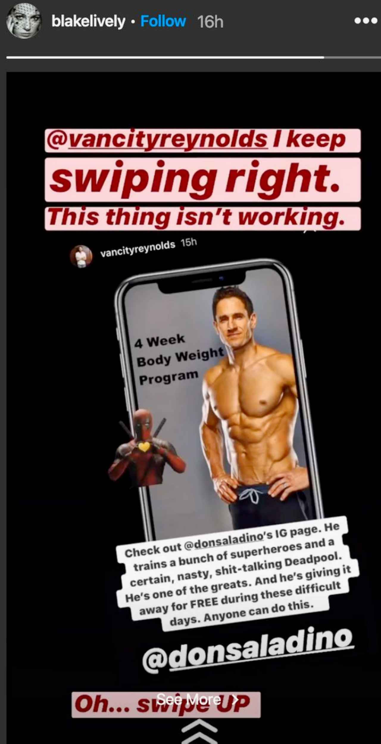 ライアンの宣伝を自分のインスタグラムストーリーでシェアしたブレイクは、ライアンに宛てて「“右スワイプ”しまくってるのに、ぜんぜん機能しないんだけど」とクレーム。