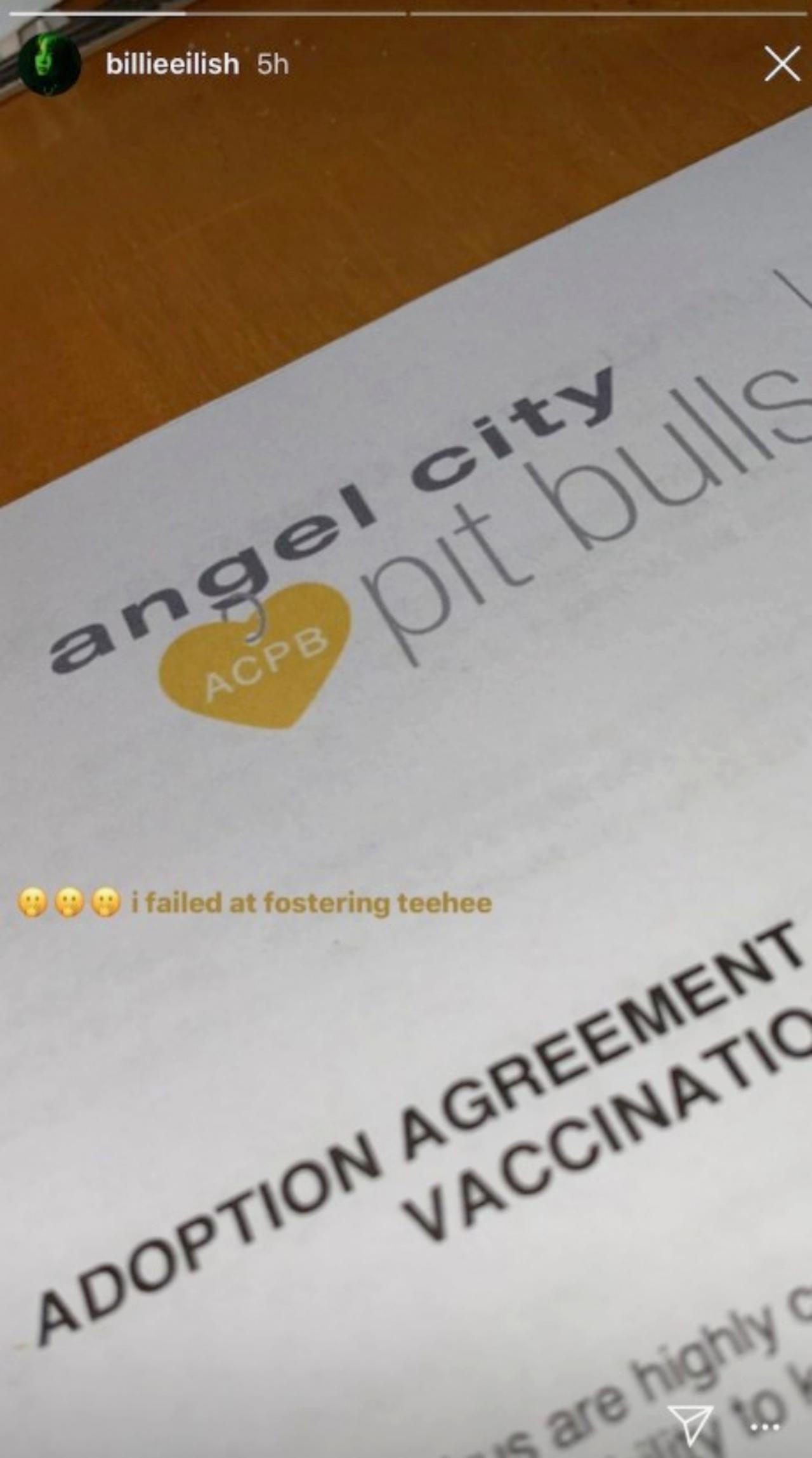 犬の養子縁組契約書と書かれた書類の一部をインスタグラムストーリーで公開したビリーは、「里親業に失敗しちゃった。てへへ」とコメント。