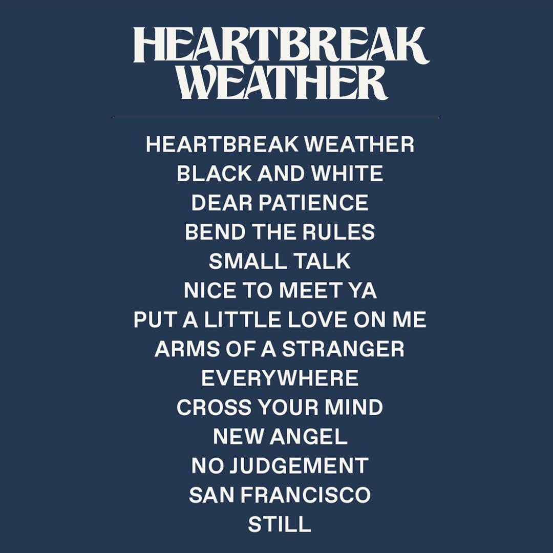 『ハートブレイク・ウェザー』には、先ほど話に挙がった「プット・ア・リトル・ラヴ・オン・ミー」のほか、大ヒット中のシングル「ナイス・トゥ・ミート・ヤ(Nice To Meet Ya)」や、2月7日にリリースしたばかりの新曲「ノー・ジャッジメント(No Judgement)」など、全14曲が収録。国内盤CDにはボーナストラックとしてさらに2曲が追加され、全16曲収録したものが同日発売される。