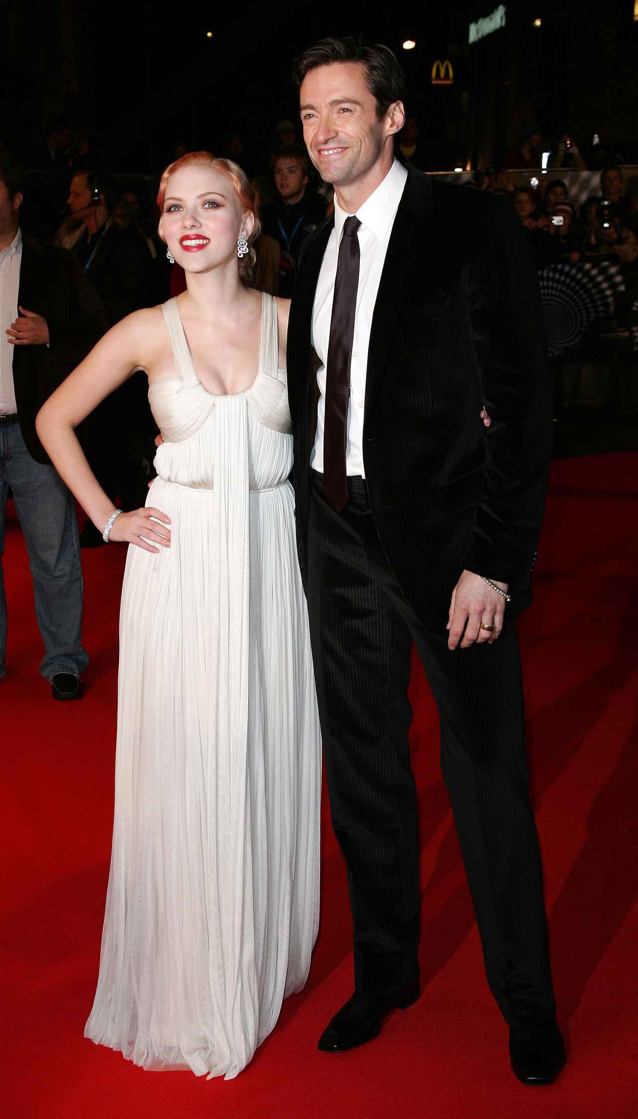 2006年、映画『プレステージ』のUKプレミアに出席したヒュー・ジャックマンとスカーレット・ヨハンソン。