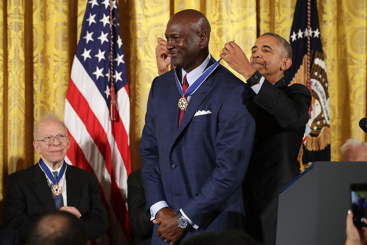 2016年、マイケル・ジョーダンに大統領自由勲章を授与するオバマ元大統領。