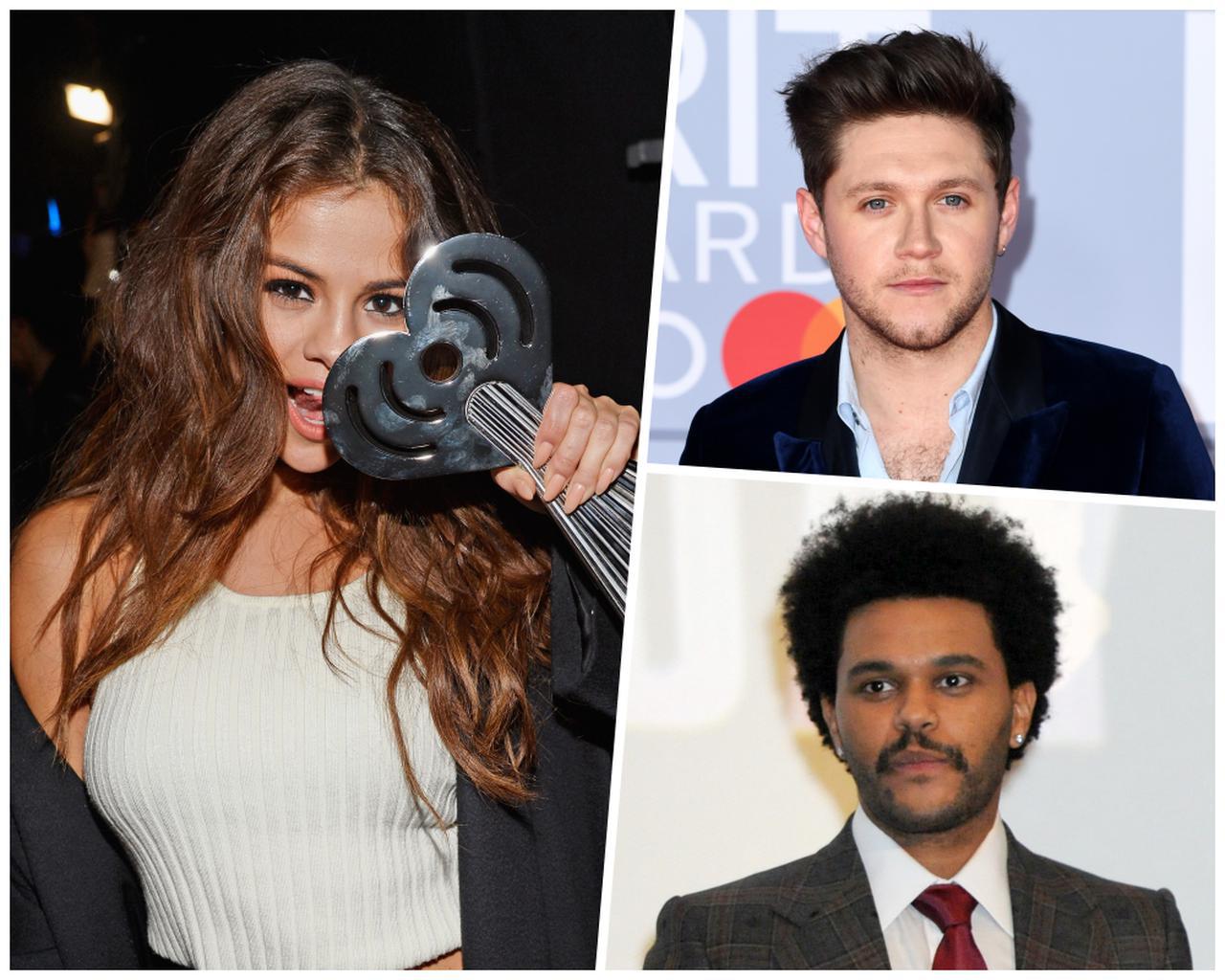 セレーナ・ゴメス(左)、ナイル・ホーラン(右上)、ザ・ウィークエンド(右下)。