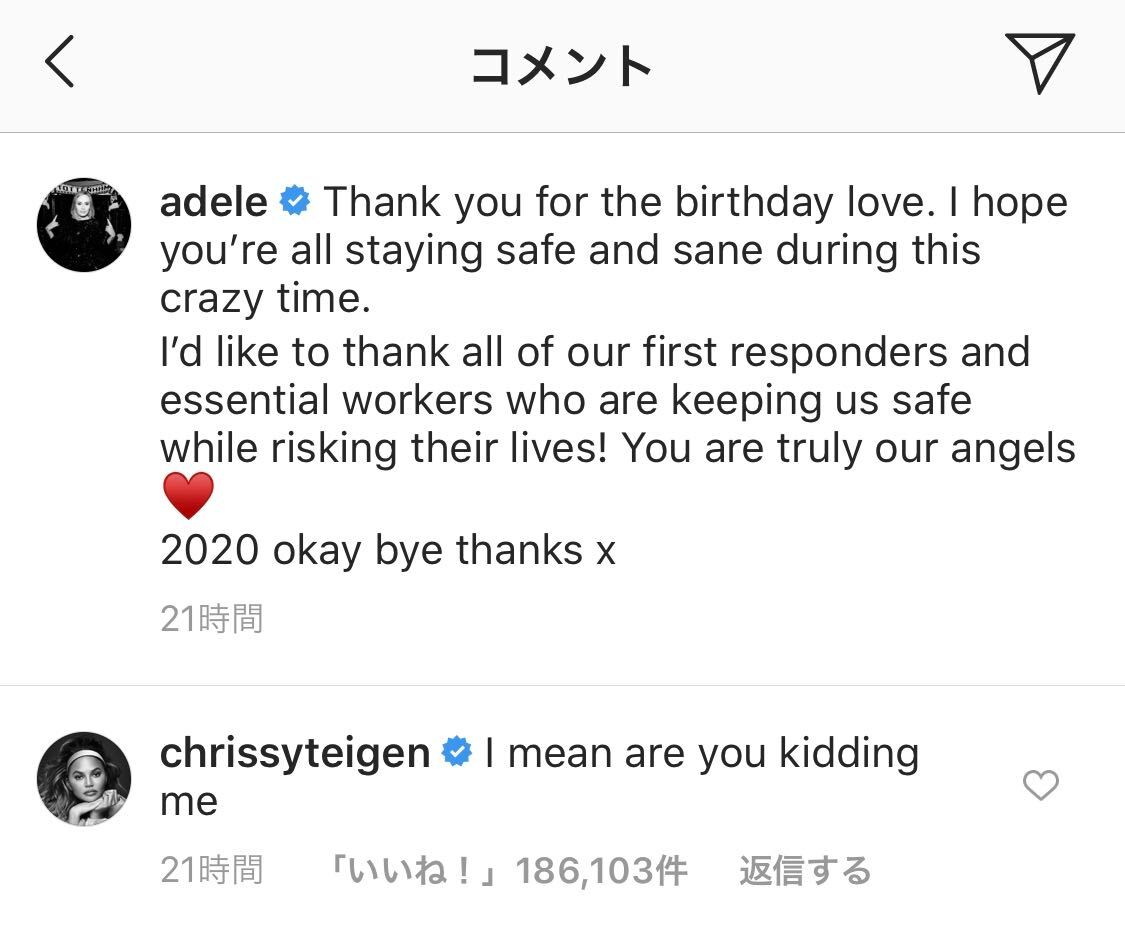 アデルの変貌ぶりに大きなショックを受ける様子をシンプルに表現した、まるでツッコミのようなこのクリッシーのコメントは、彼女と同じく度肝を抜かれた多くの人々の心境を代弁しているようで、10万件超える、ものすごい数のユーザーの共感を得た。