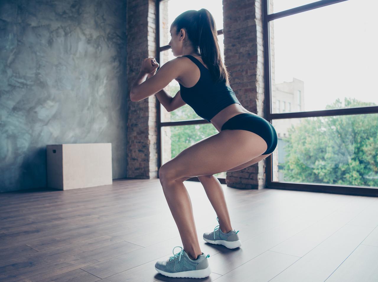 ステップ2:お尻を後ろに突き出しながらひざを曲げ、体を下げていく。太ももと床が平行になるところまで下げたら、ステップ1の姿勢に戻る。この動作を15回行なう。
