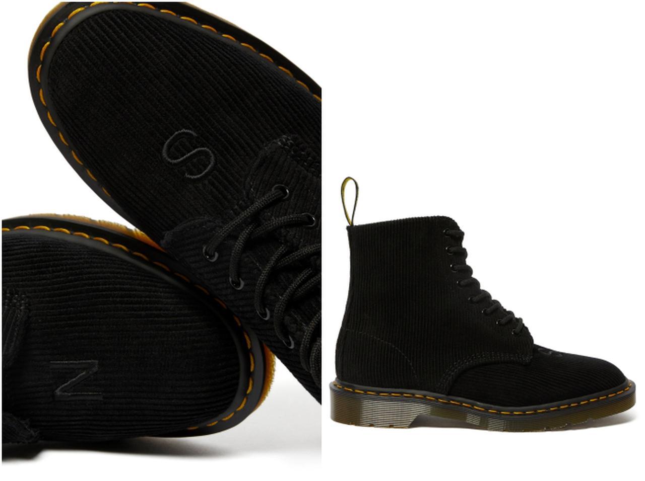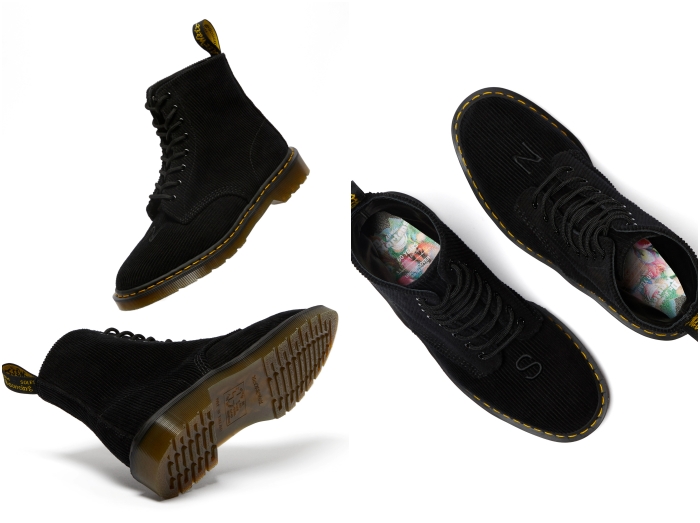 アッパーに英国を感じさせるミニマムなブラックコーデュロイを使用し、アンダーカバーのスローガン「Spiritual Noise(スピリチュアルノイズ)」の頭文字「S」と「N」を刺しゅうで施した。それと同時に、ドクターマーチンを象徴するイエローのステッチとヒールループを備え、ドクターマーチンとアンダーカバーの両DNAが色濃く反映された特別な一足に仕上がっている。