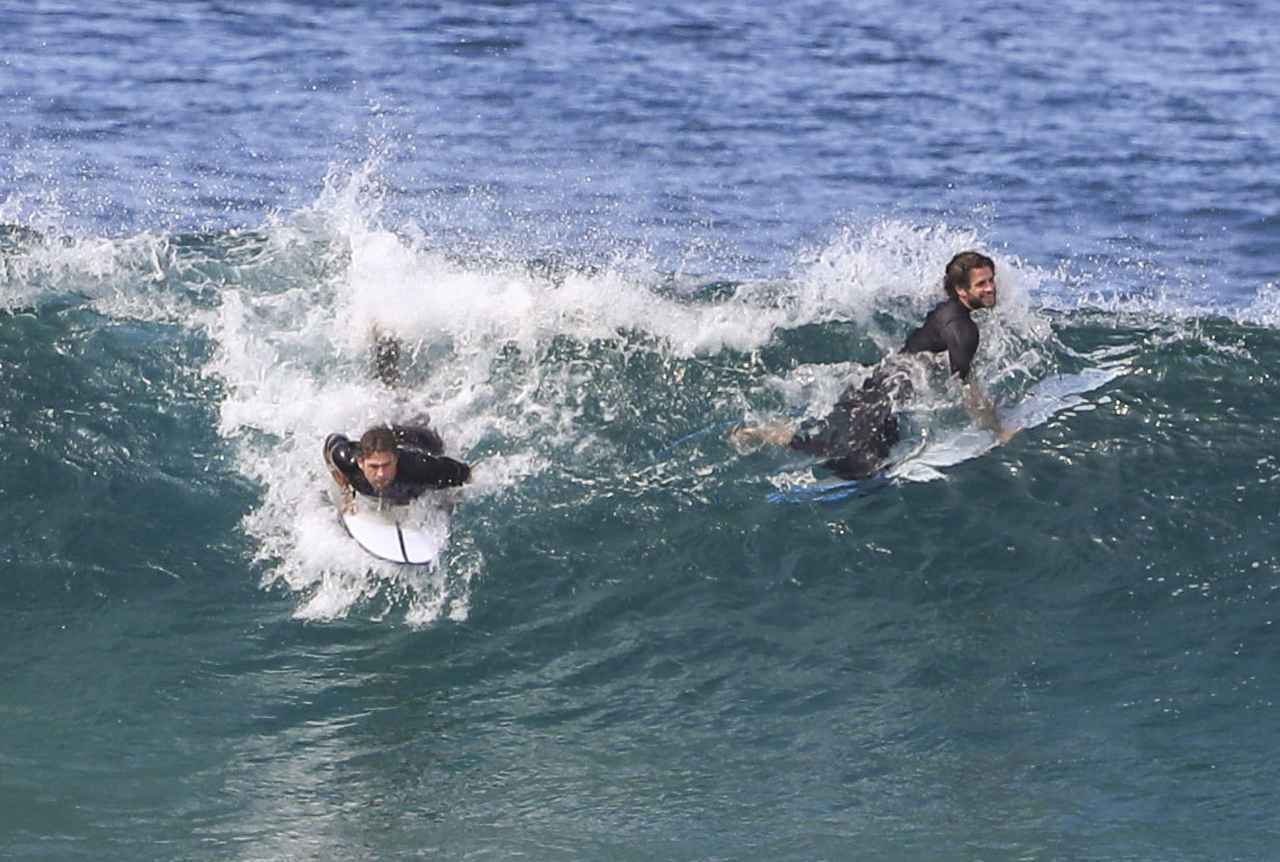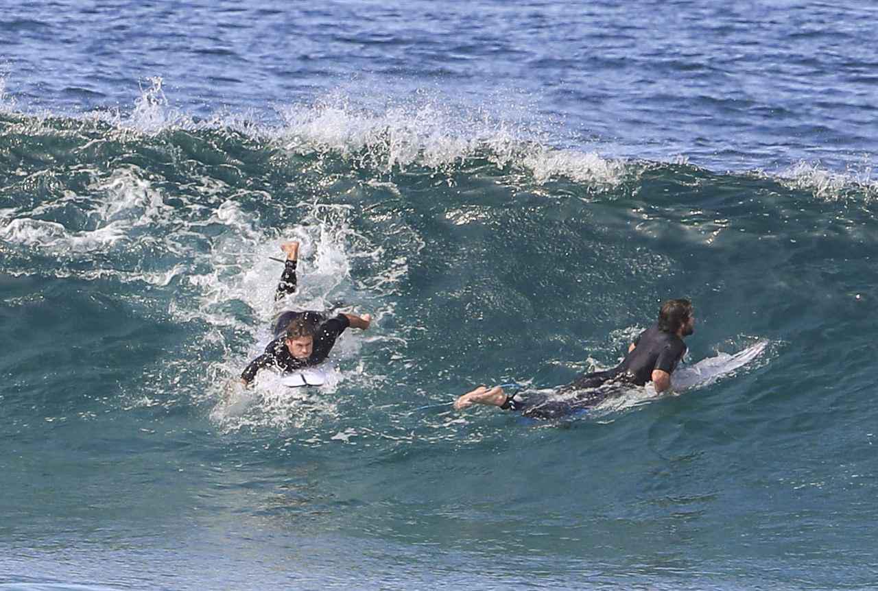 クリスもリアムも、これまで何度もサーフィンをしている姿が目撃されているほどの熱心なサーファーだけれど、この日も海を見ながらなにやら会話。そして、近距離で一緒に波に乗ったクリスとリアムの姿がこちら。