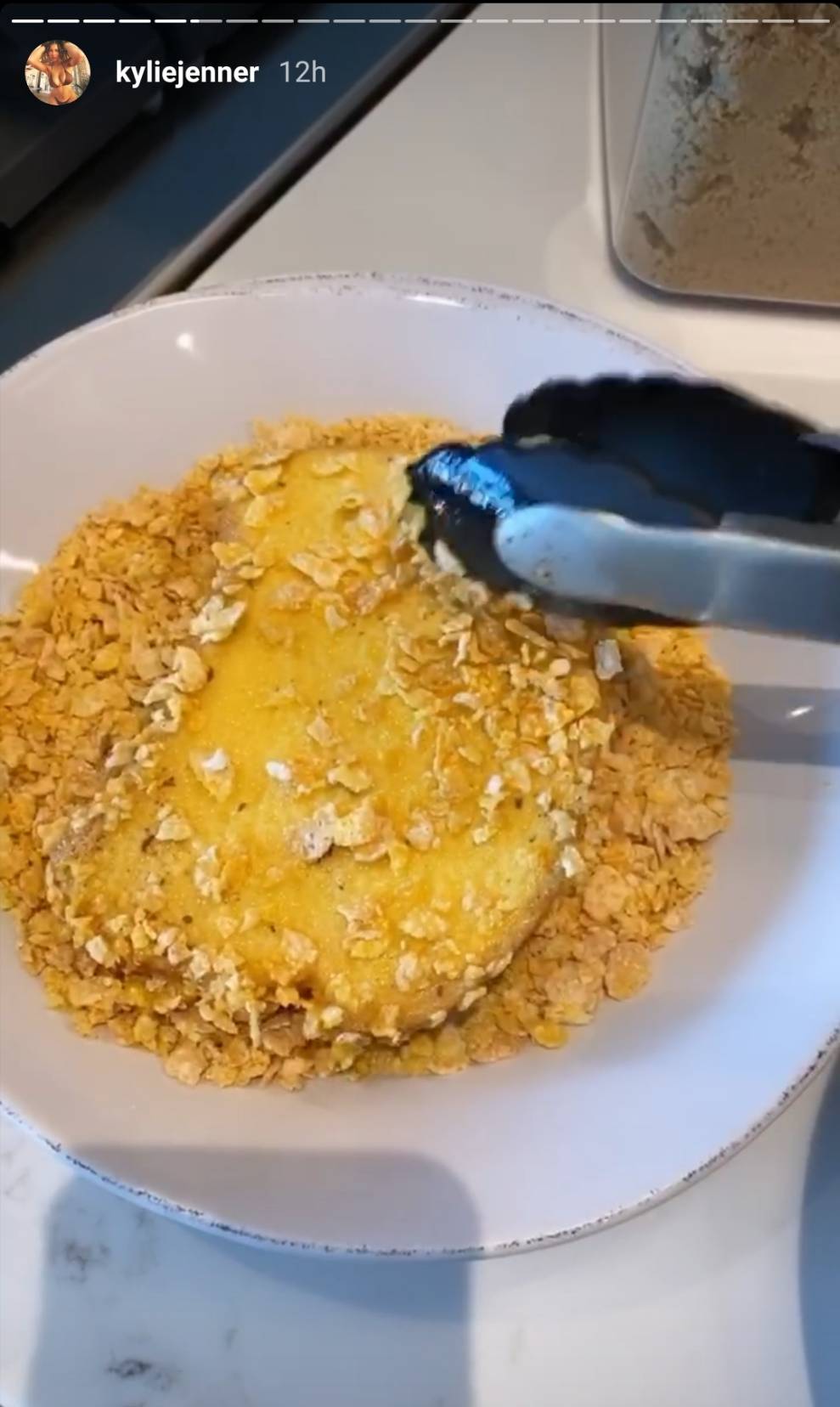 カイリーは、姉であるクロエ・カーダシアンに影響を受けてこのフレンチトーストを作ったと自身のインスタグラムで語っており、このコーンフロスティをつけた香ばしいフレンチトーストはカーダシアン家のなかでは定番なのかもしれない。