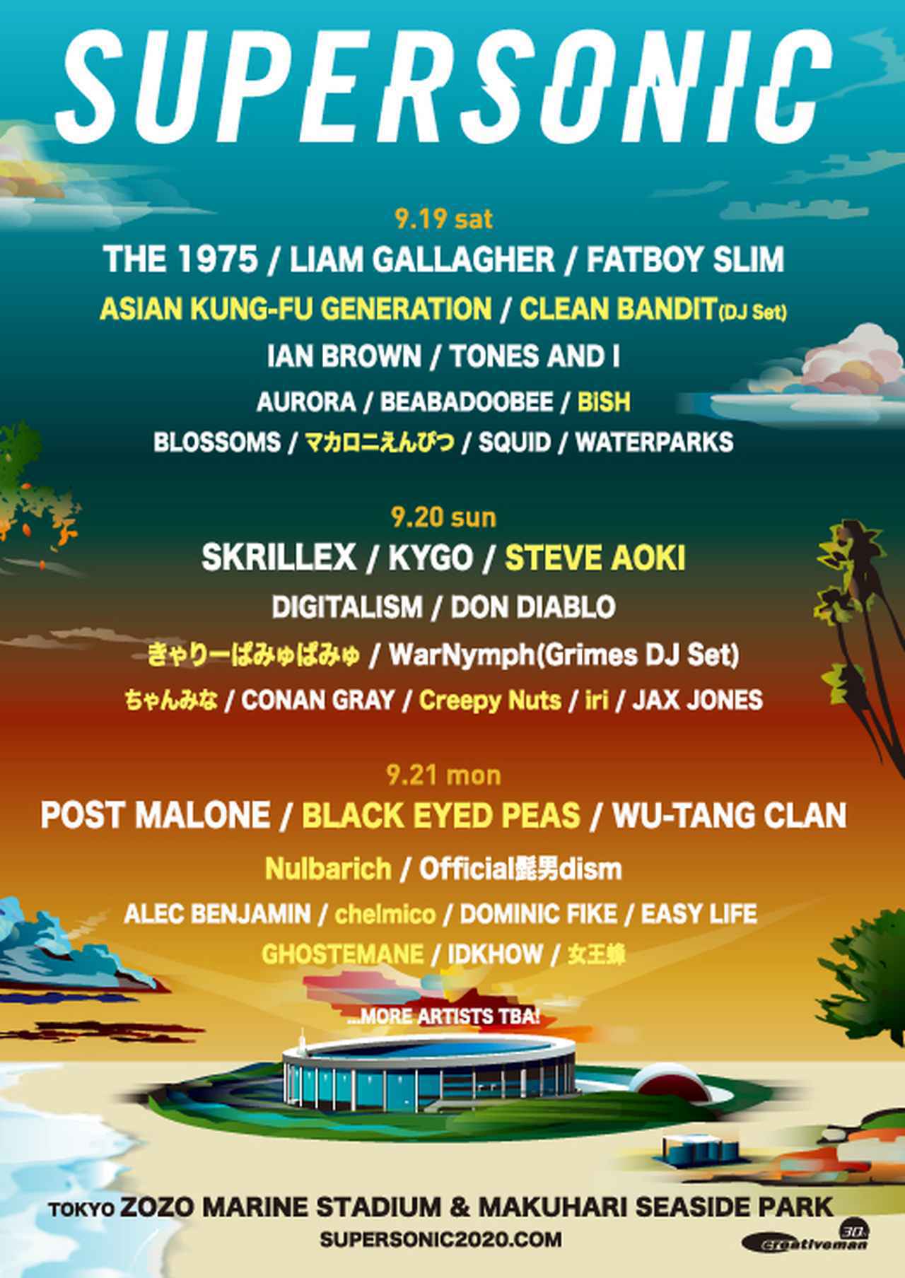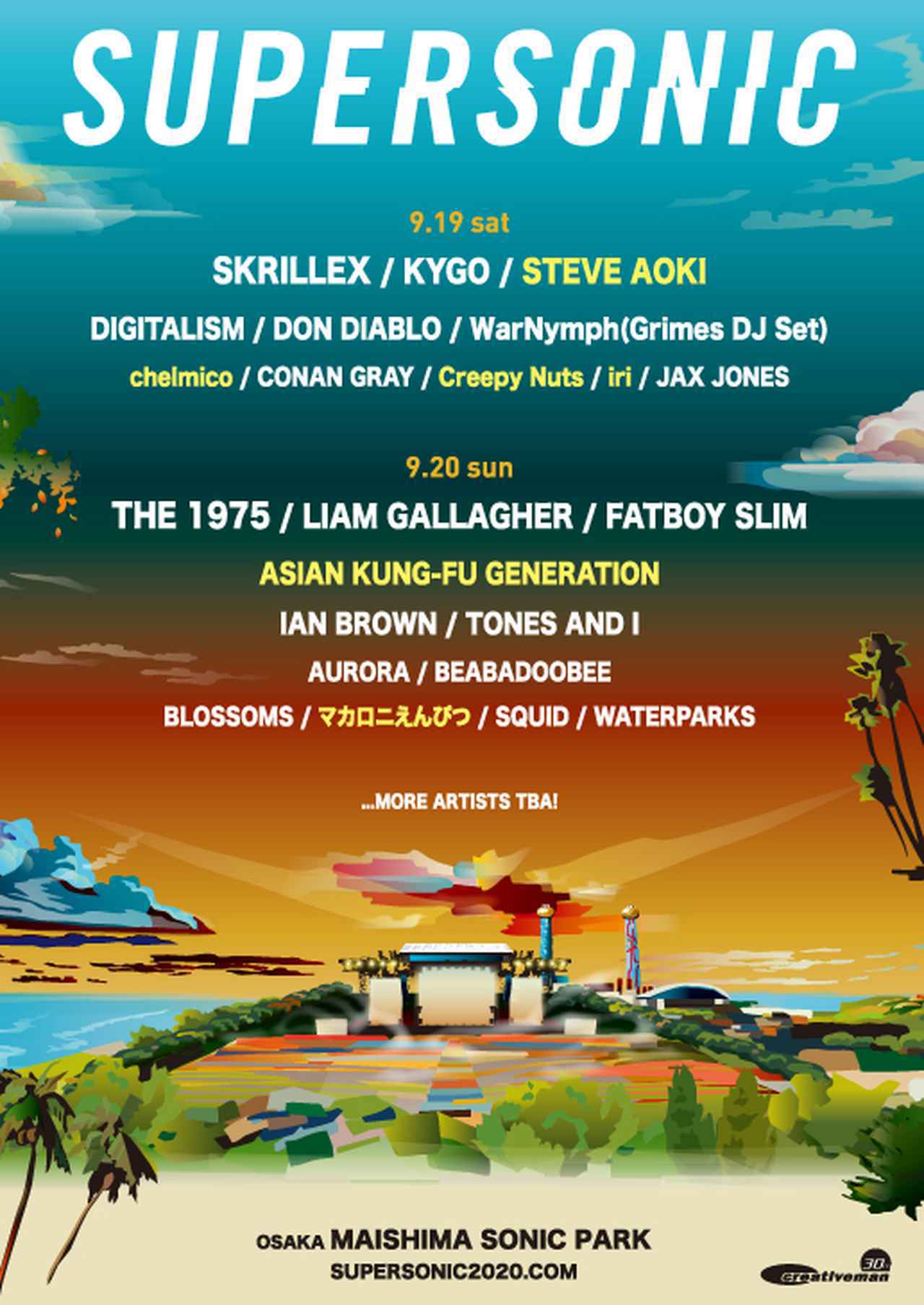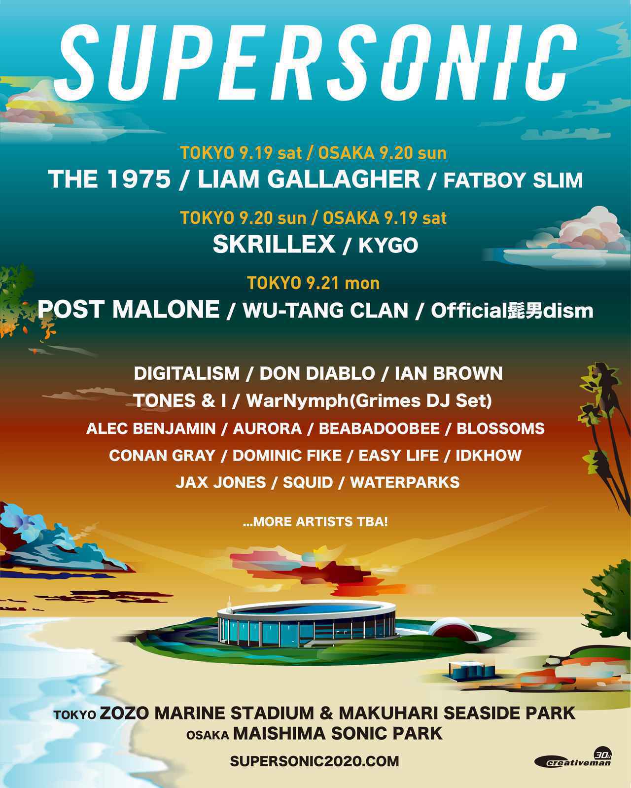 2020年は東京オリンピックが予定されていたため、毎年8月に行なわれる日本最大の都市型フェス、サマーソニックは行なわれず、2020年限定フェスであるスーパーソニックを開催。9月19日~21日に千葉県 ZOZOマリンスタジアム / 幕張シーサイドパーク、9月19日~20日に大阪府 舞洲SONIC PARK(舞洲スポーツアイランド)で開催予定されているスーパーソニックには、リアム・ギャラガーをはじめ、ポスト・マローン、スクリレックス、The1975、ファットボーイ・スリムといった豪華アーティストの出演が発表されていた。