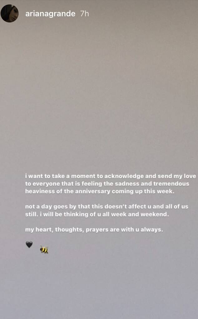 このメッセージには、黒いハートの絵文字と、アリアナがタトゥーでも入れ、楽曲「ノー・ティアーズ・レフト・トゥ・クライ」のMVにも登場した、マンチェスターのシンボルでもあり、事件以降は、爆破テロの被害者たちへの追悼や支援の意味を併せもつ蜂の絵文字が添えられていた。