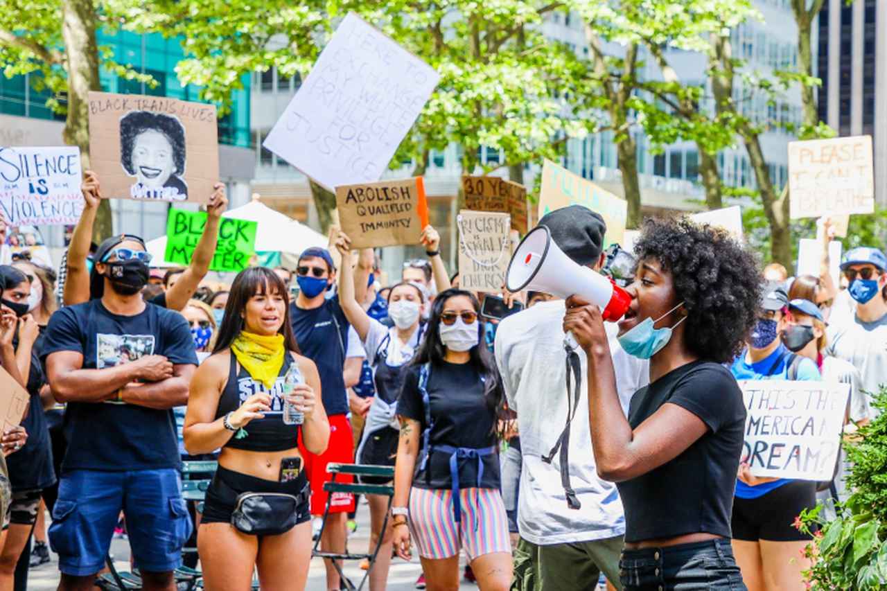 6月7日、ニューヨークのタイムズ・スクエア周辺で行なわれたデモの様子。