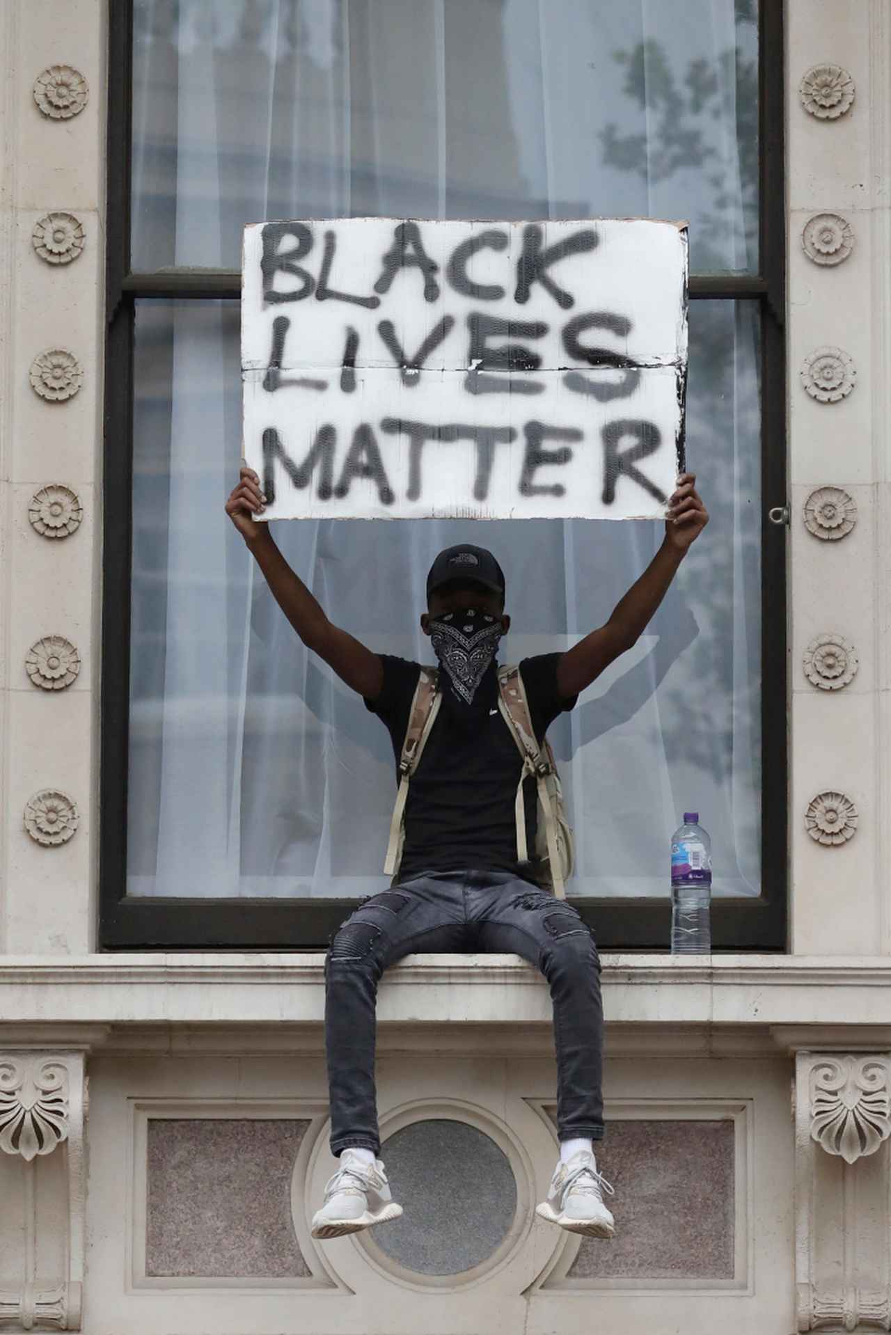 6月3日に行なわれたイギリス・ロンドンでのデモで外務・英連邦省の建物の窓枠に腰掛け「Black Lives Matter」のプラカードを掲げる黒人の少年。