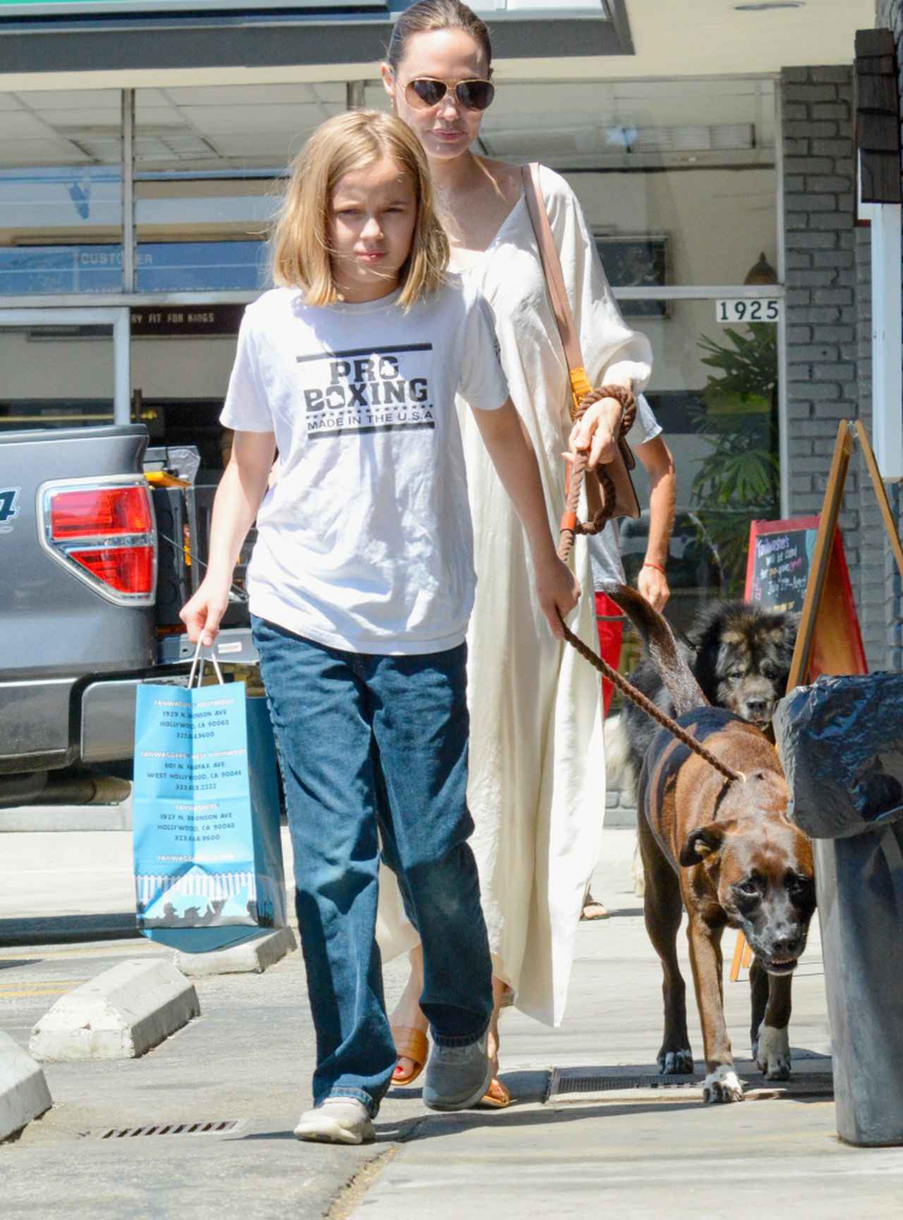 ヴィヴィアンと一緒に愛犬を連れてペットショップに買い物に出かけたアンジェリーナ。(2019年8月撮影)