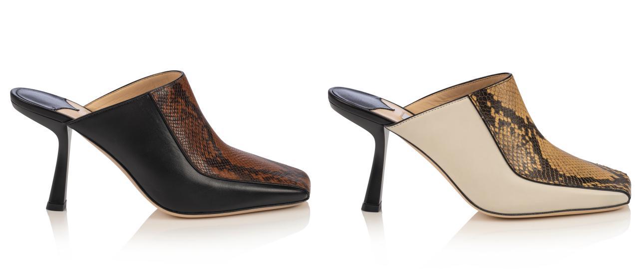 シャープでアシンメトリックなスクエアトゥは、コレクションで注目の新シルエット。今シーズン登場する「キック」ヒール、「スクープ」ヒール、「V」ヒールといった構築的なヒールと絶妙なバランスで組み合わせられている。