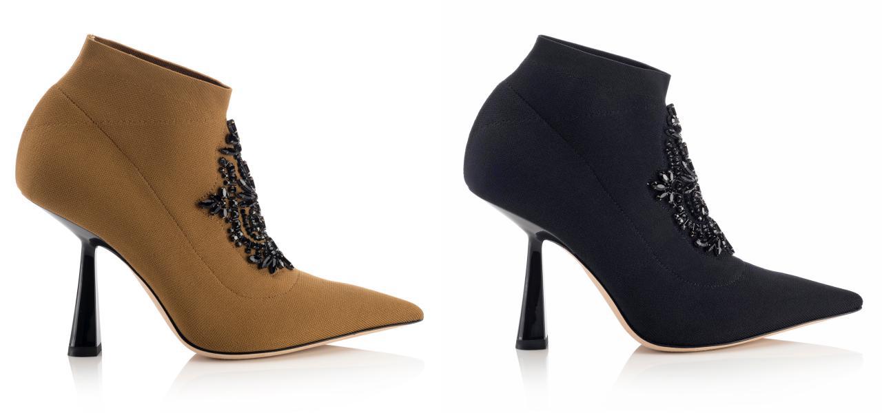 イブニングスタイルのKENDRIX アンクルブーツには、パールとジュエルの刺繍が施され、まるでジュエリーのような美しさを誇っている。