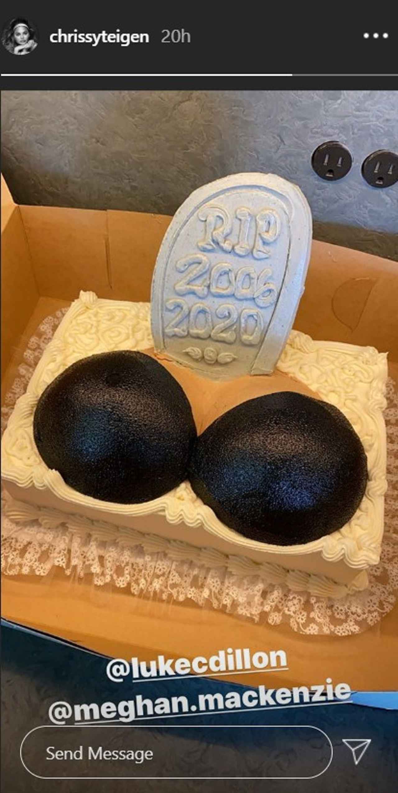 20歳の頃から連れ添った豊胸インプラントに別れを告げたクリッシーに贈られたのは、まだシリコンバッグが入っていた頃のクリッシーの巨乳と、それを弔う墓石を象ったモチーフが乗ったケーキ。