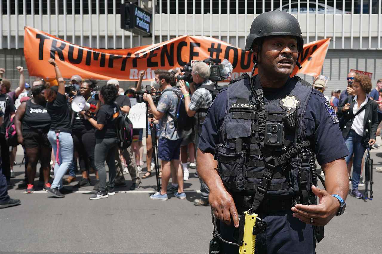 会場周辺ではトランプ米大統領に反対する人々がデモを行なっていた。