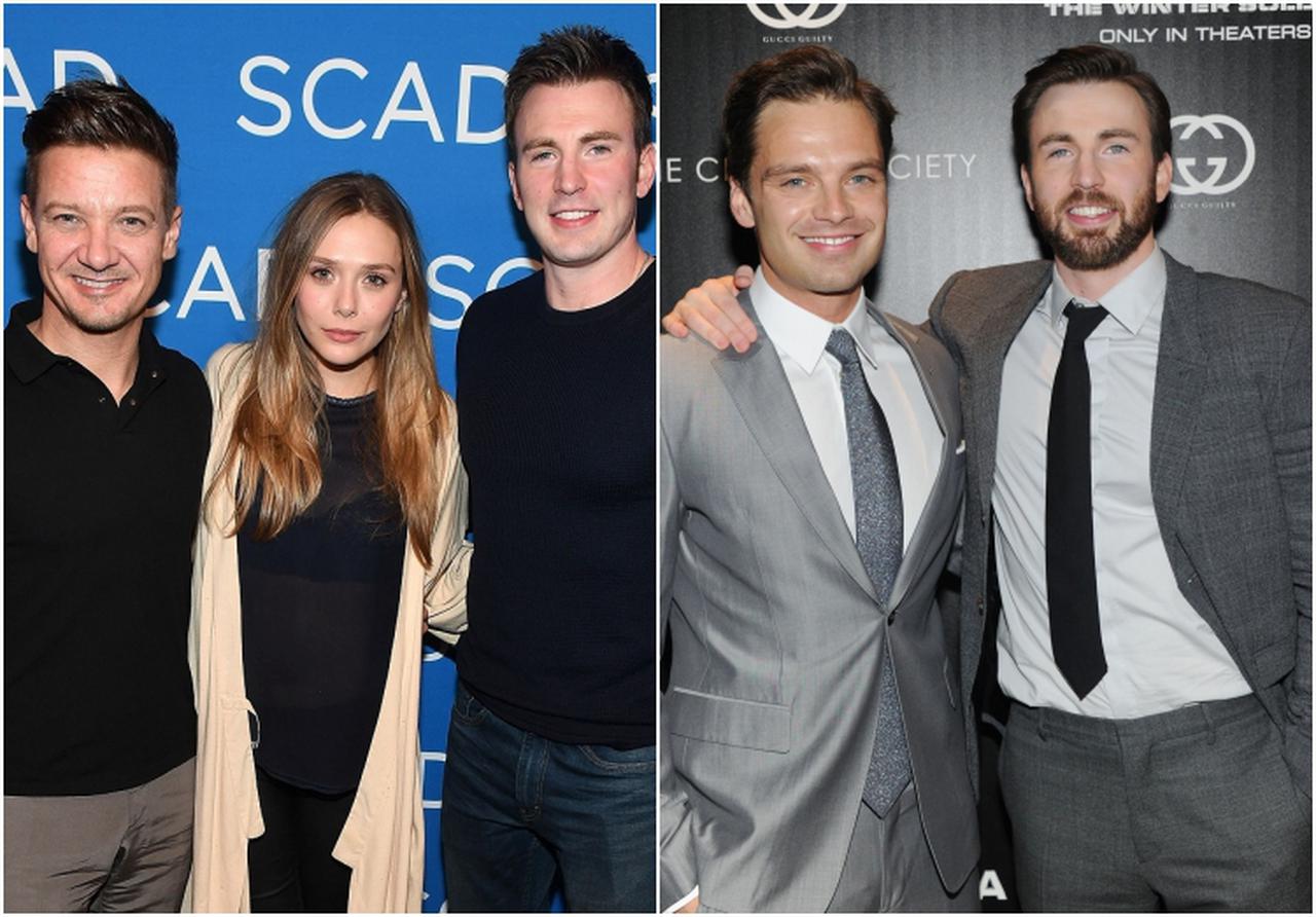 左:ジェレミー・レナー、エリザベス・オルセン、クリス。右:セバスチャン・スタンとクリス。