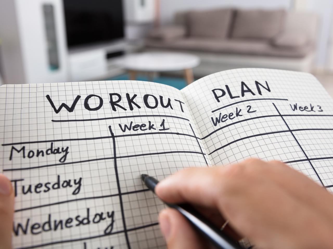 まずこの1ヵ月集中型プランでは、週6日はワークアウトの日。その内訳は、週のうち3日が有酸素運動、残り3日は、それぞれ脚のワークアウト、腕と腹筋のワークアウト、全身のワークアウトと1日ごとにパーツに絞って行なう。