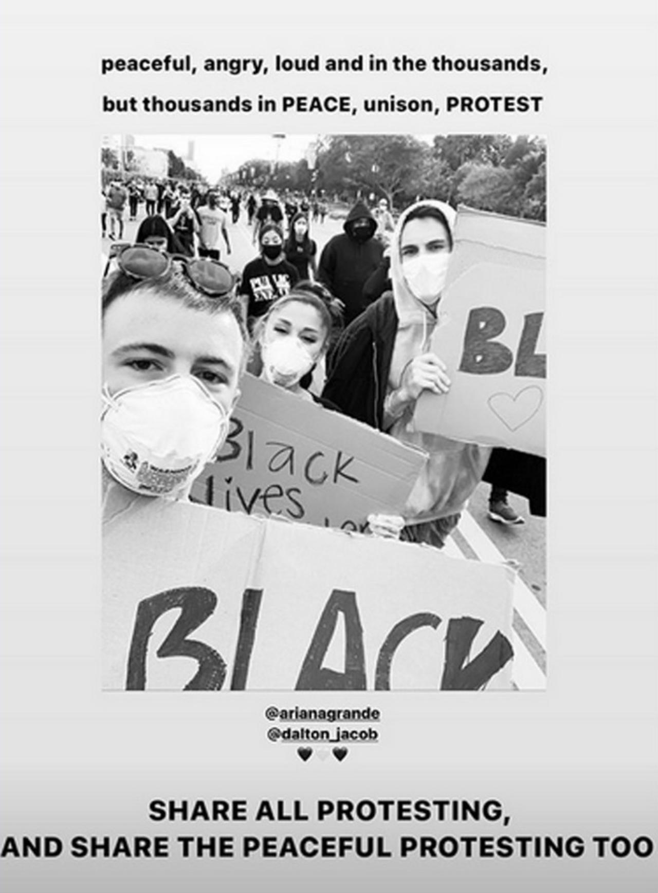 アリアナが6月頭にロサンゼルス市内で行なわれた人種差別抗議デモ「Black Lives Matter(ブラック・ライヴズ・マター/黒人の命も価値がある)」の平和的行進に参加した際も、傍らには彼の姿があり、同行したアリアナの親友ダグ・ミドルブルックのインスタグラムストーリーでは、アリアナとダルトンとともに撮影したデモ参加中の写真が公開された。