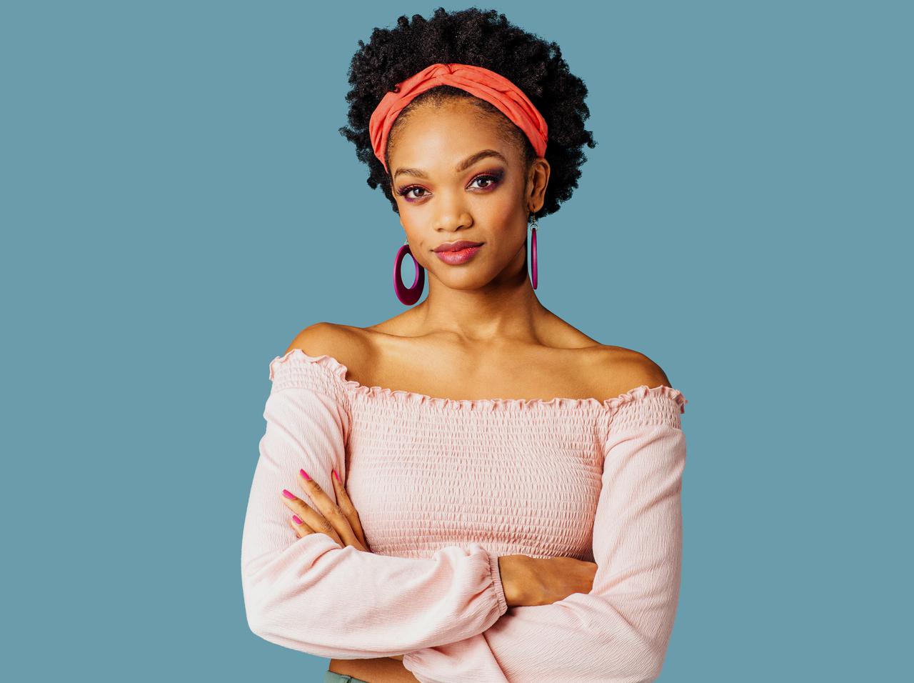 トップスとマッチしたラベンダーカラーのヘアバンドを巻いたアレンジが、90年代っぽくてカワイイ。タイトなヘアバンドに、ボリュームのあるウェーブヘアの三つ編みが好バランス。