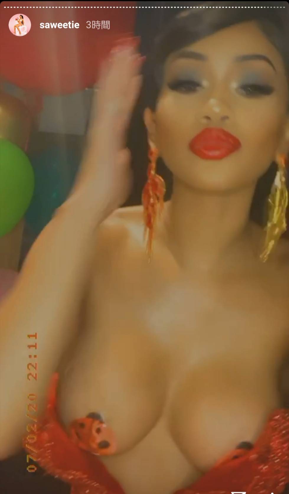 このドレスは、胸元がガッツリとあいているため、スウィーティーは乳首が見えてしまわないようにニップルシールを。そのニップルシールは、セクシーな姿とは裏腹に、なんとテントウ虫という可愛すぎるものをチョイスし、ギャップをみせた。