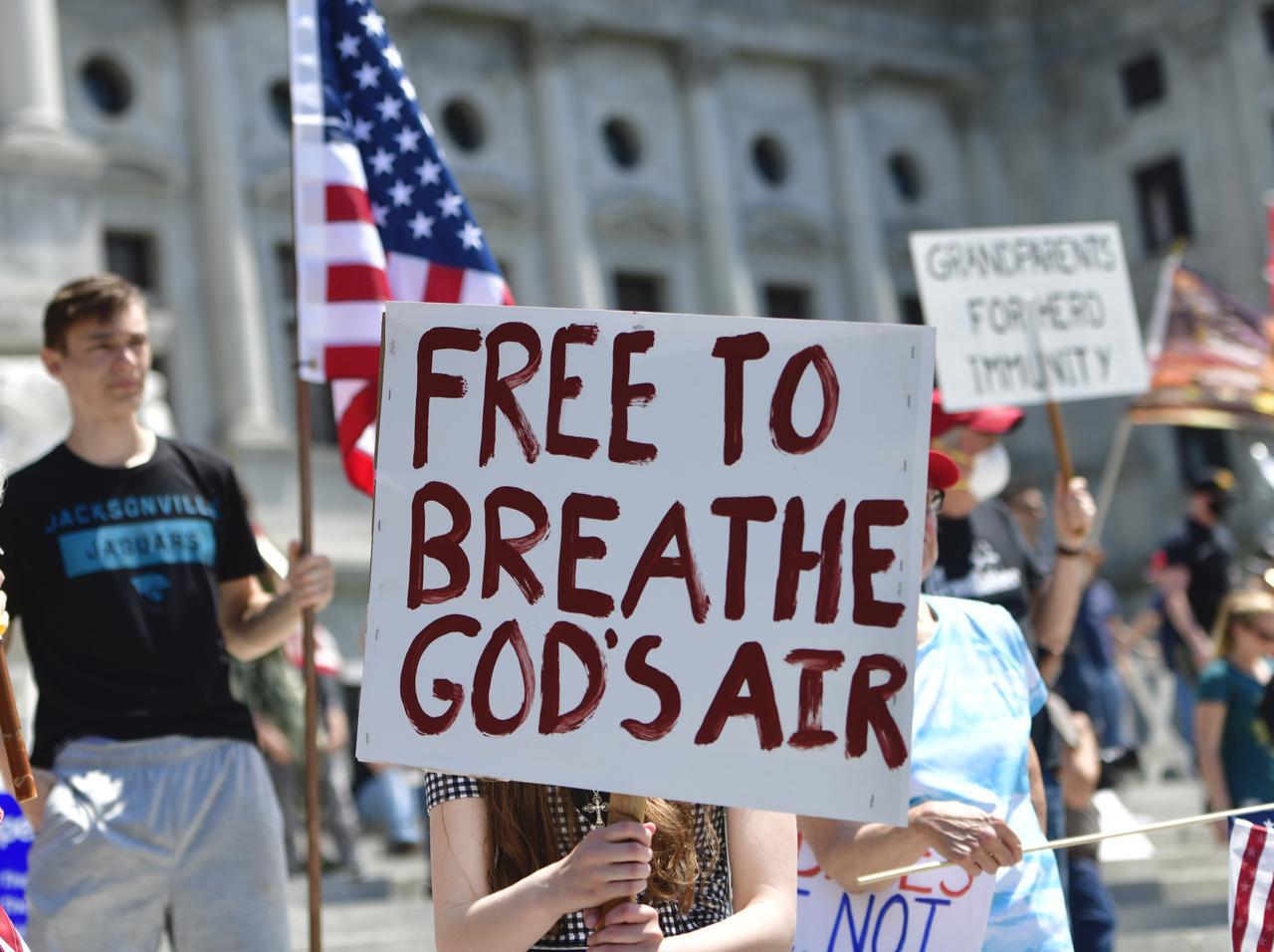 ロックダウンに反対するデモの様子。(2020年5月15日にアメリカのペンシルベニア州で撮影)