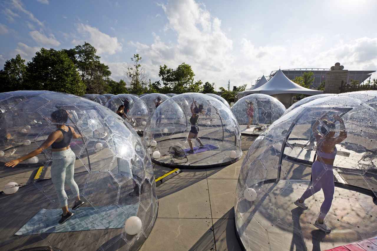 屋外に50個のドームが用意され、前方でインストラクターが教えてくれる。まさに、完璧なソーシャルディスタンスを実現したフィットネス。