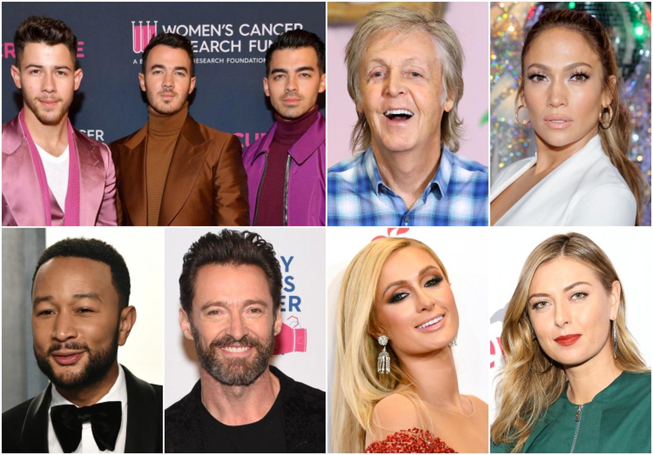 上段左から:ジョナス・ブラザーズのニック・ジョナス、ケヴィン・ジョナス、ジョー・ジョナス。ポール・マッカートニー、ジェニファー・ロペス。下段左から:ジョン・レジェンド、ヒュー・ジャックマン、パリス・ヒルトン、マリア・シャラポワ。