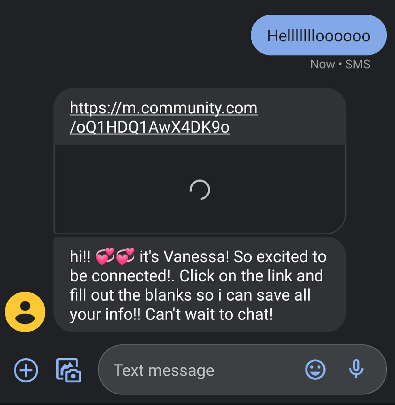 ヴァネッサが公開した電話番号にフロントロウがテキストを送ってみたところ、すぐに、とあるURLが添えられたこんな自動メッセージが返ってきた。