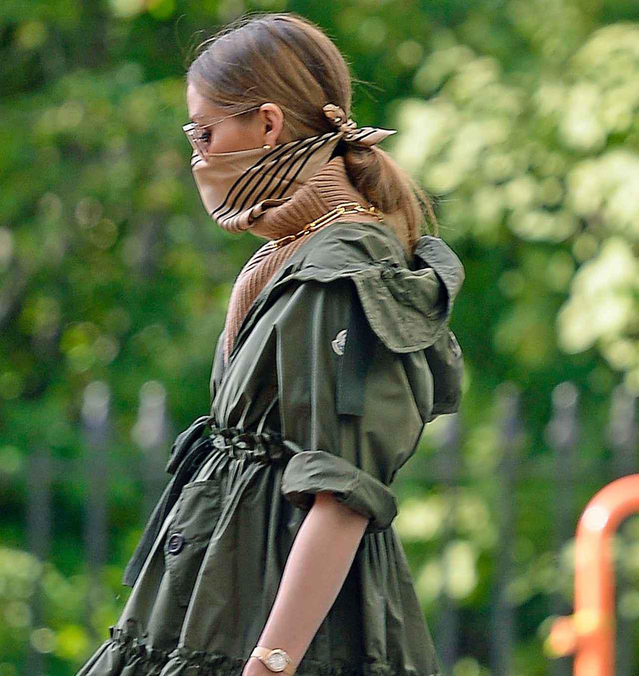 でも最近のお気に入りは、だんぜんスカーフスタイル。スカーフをマスクがわりに使ったオリヴィアのコーディネートをチェック。