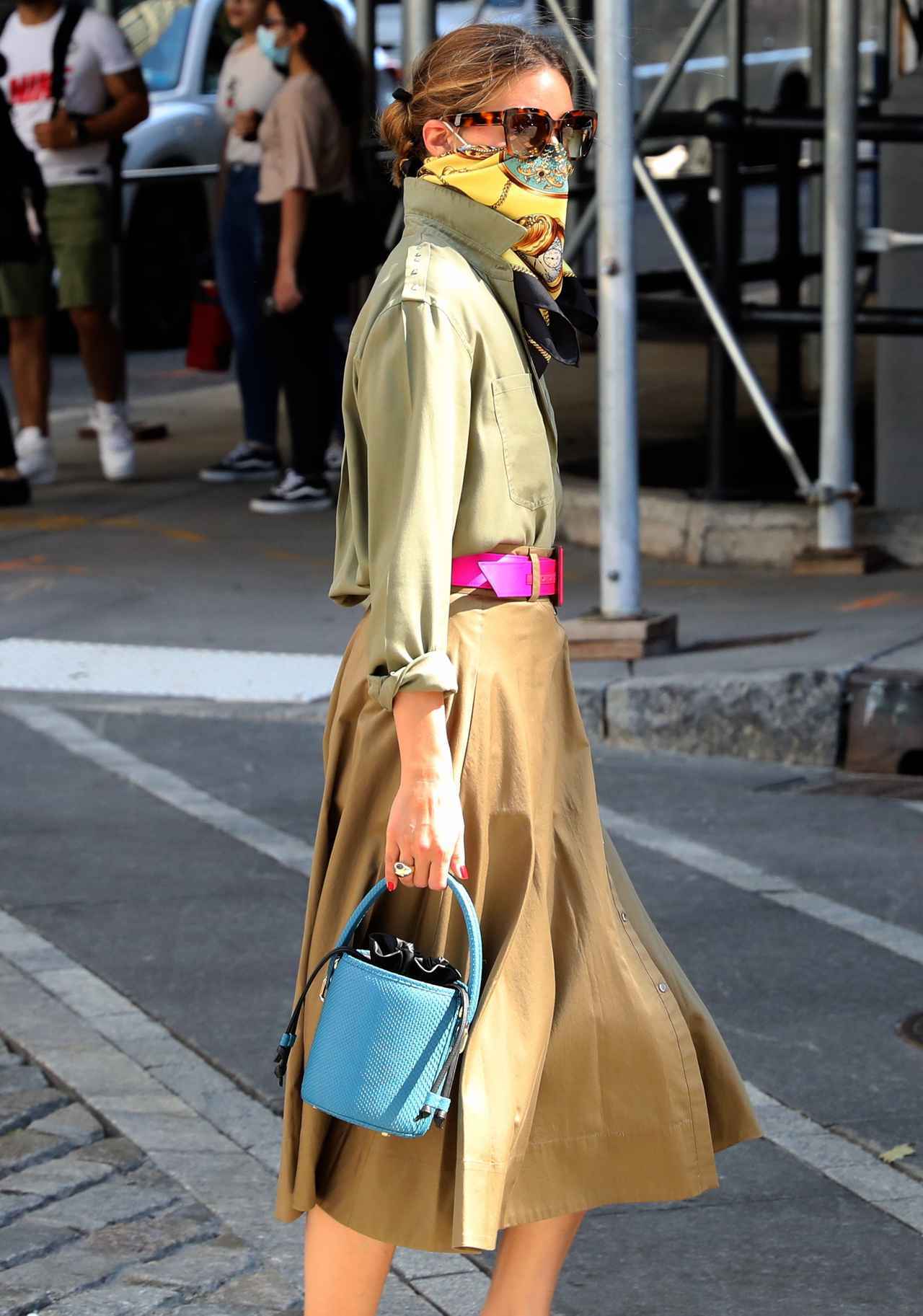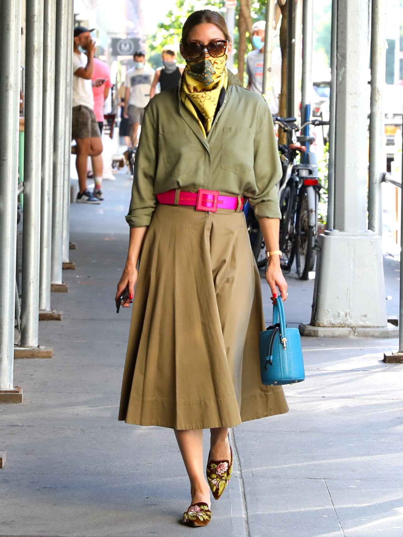 この日のオリヴィアはブルックリンにお出かけ。カーキのトップスに微妙に色の違うミディスカートを合わせ、ホットピンクのベルト、ターコイズカラーのバッグ、そしてイエローのスカーフとポップなカラーを見事に投入。