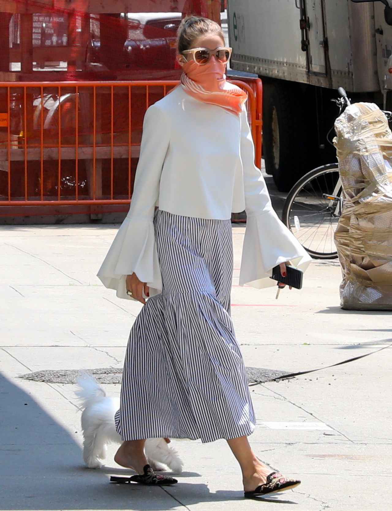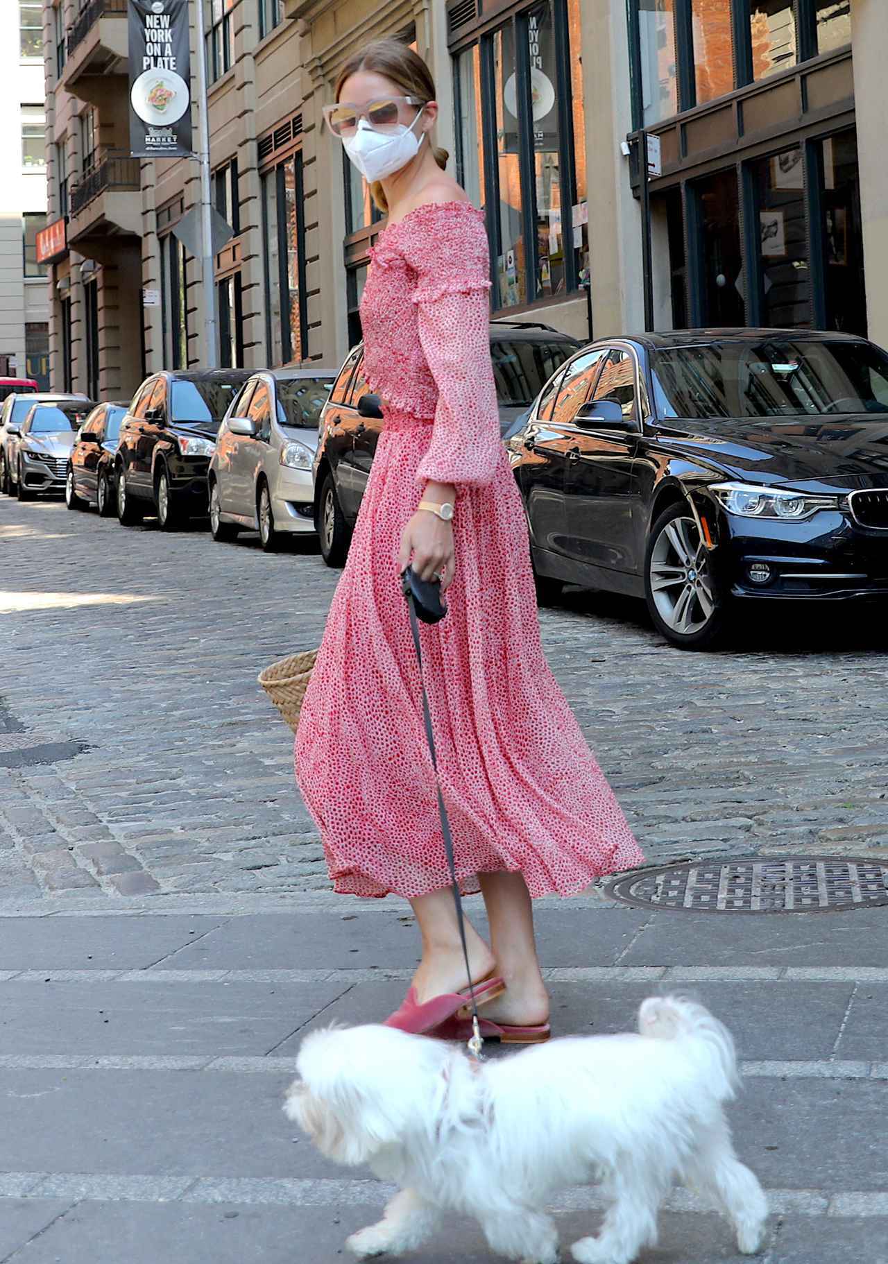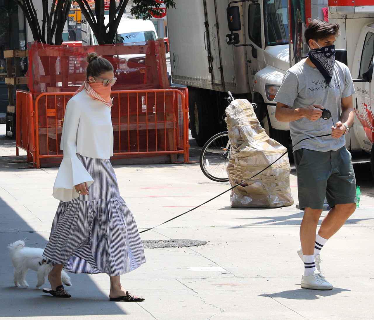 そんなオリヴィアは、ファッションとの組み合わせが難しいマスクについてもオシャレに工夫。愛犬ミスター・バトラーの散歩のため、ニューヨークの街でしばしば姿が見かけられるオリヴィアは、当初は通常のマスクをつけていた。