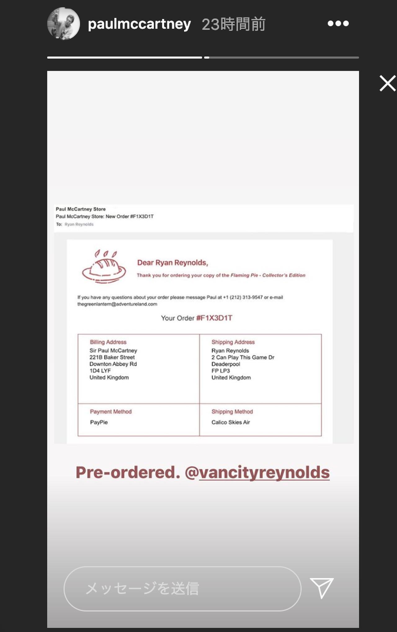 販売元であるエリザベス女王の慈善団体「ロイヤル・コレクション・トラスト」の公式オンラインショップでバッキンガム・パレス・ジンの購入予約を行なったライアンは、そのレシートを自身のインスタグラムで公開し、バッキンガム宮殿のジオタグをつけて「事前オーダーした」と報告したのだけれど、購入証明書の送付先にはなぜか、自身の名前でなく、ポール・マッカートニーの名前が。