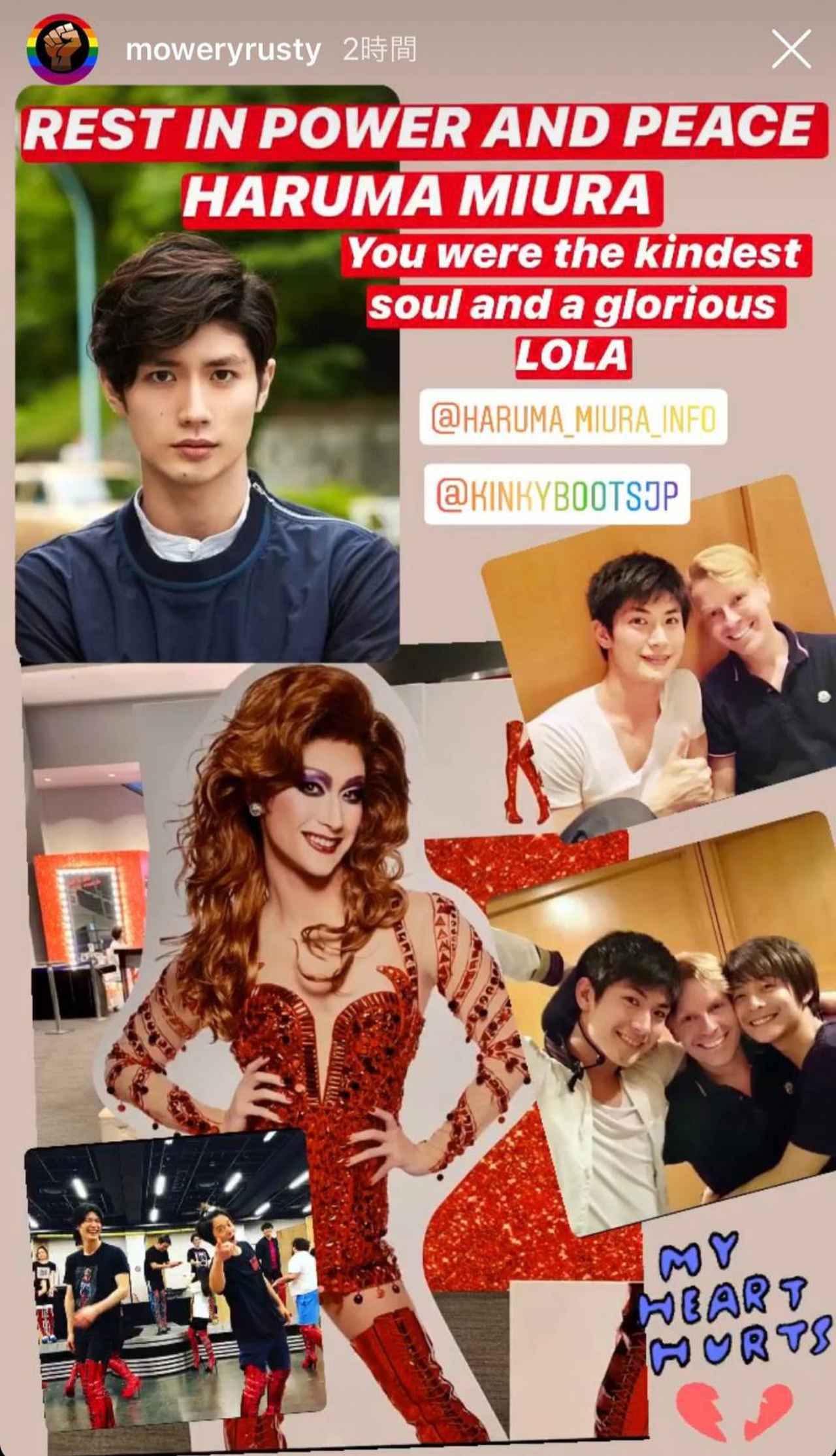 「全ての愛と祈りを『キンキーブーツ』の日本のカンパニーと家族、友人、そして親愛なる春馬のファンへ送ります。安らかに眠れ、春馬」