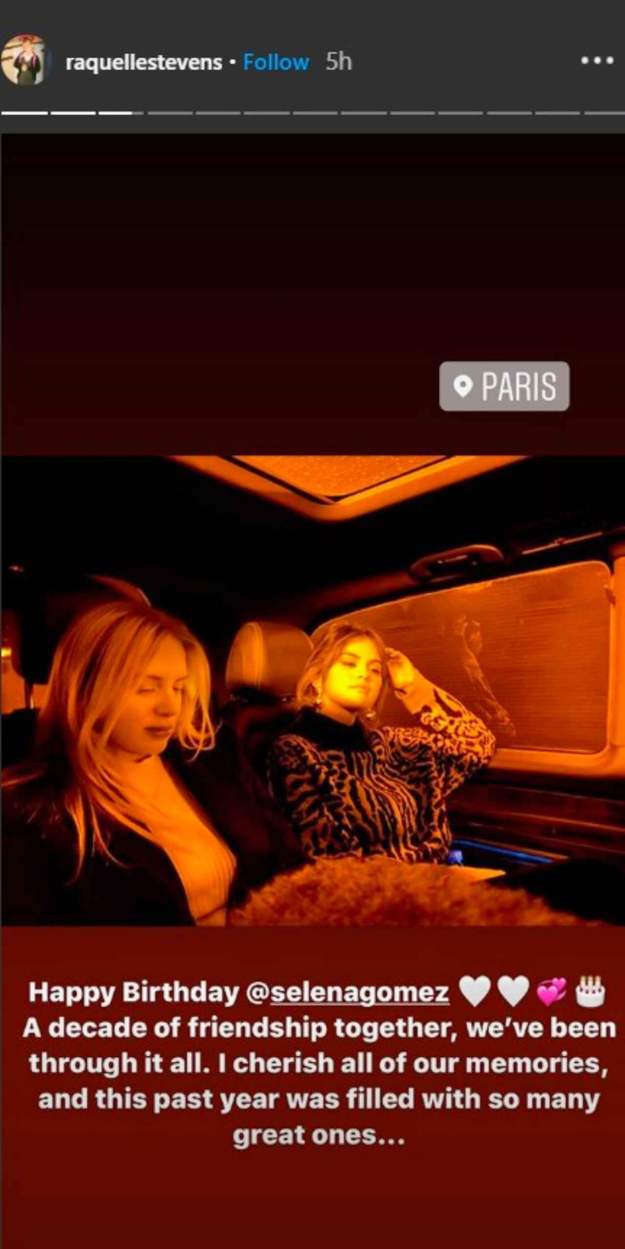 セレーナの10年来の親友でコラムニストとして活躍するラケル・スティーブンスは、「ハッピー・バースデー、セレーナ・ゴメス! 10年におよぶ友情のなかで、私たちは色んなことを一緒に経験したよね。すべての思い出が大切。この1年はとくに素晴らしい思い出であふれていたよね」というお祝いメッセージとともに、セレーナと出かけたパリ旅行の写真や地元ロサンゼルスで渋滞にハマった時のツーショットなどを公開。