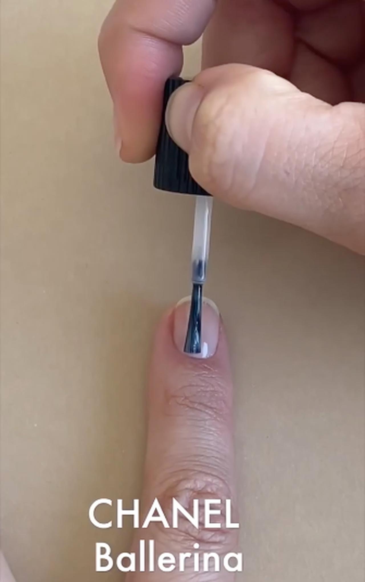 ステップ2.次に、ドットを引き立たせる、シアーピンクのベースカラーを人差し指と中指に塗る。今回ベティーナが使用したのは、シャネルのヴェルニ ロング トゥニュ(色:バレリーナ)。