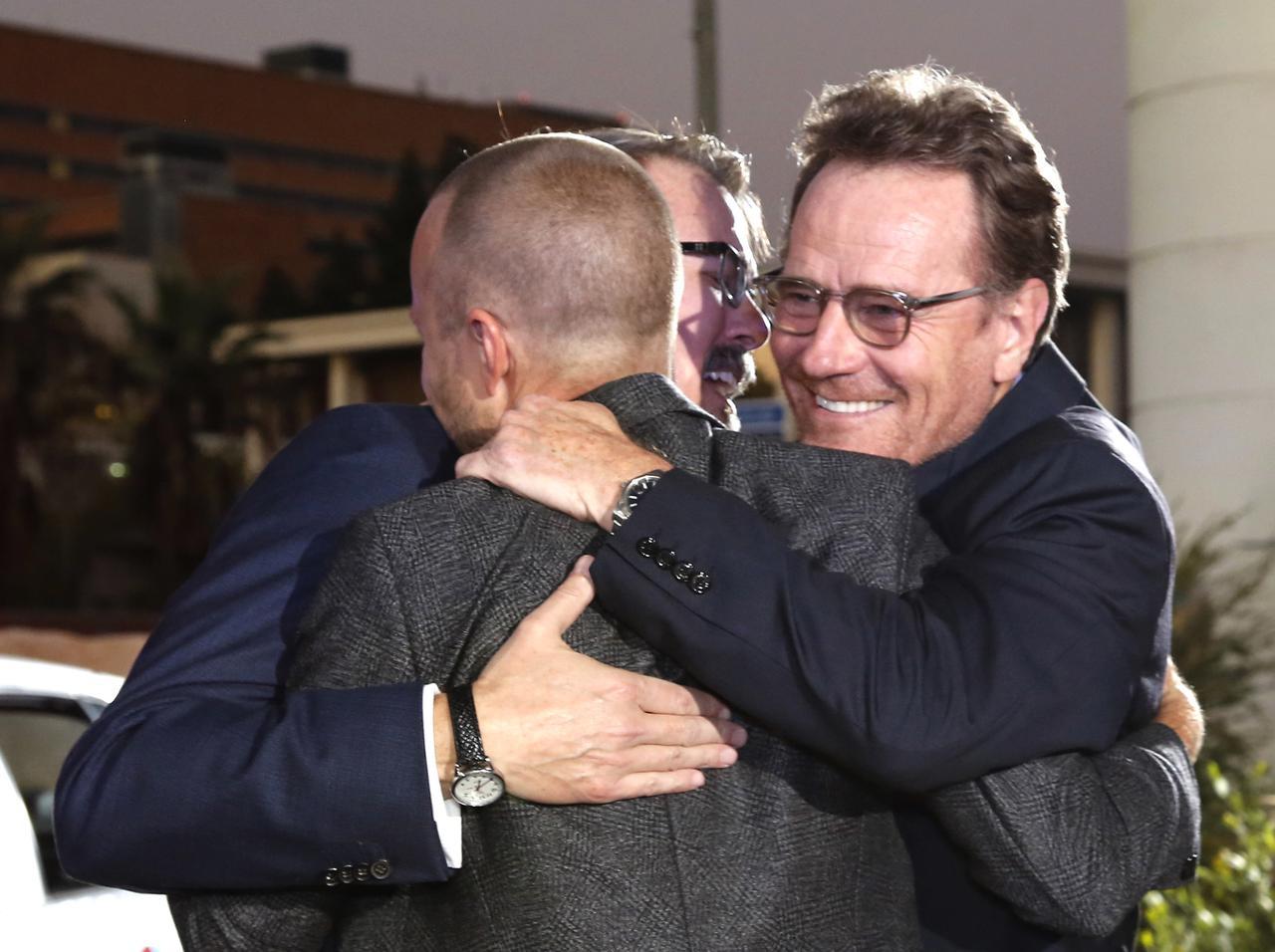 『エルカミーノ: ブレイキング・バッド THE MOVIE』のプレミアでハグするブライアン、ジェシー役のアーロン・ポール、プロデューサーのヴィンス・ギリガン。