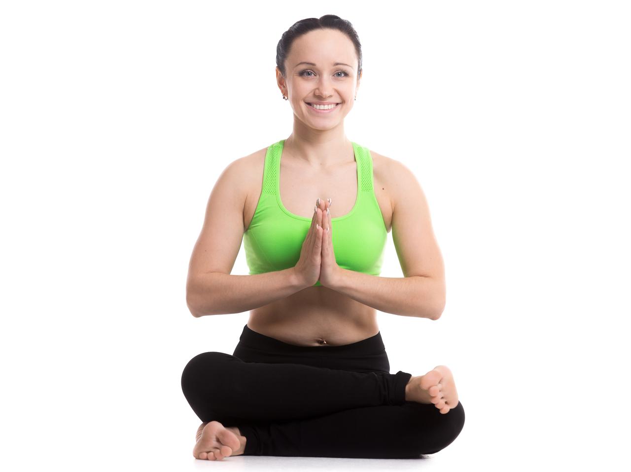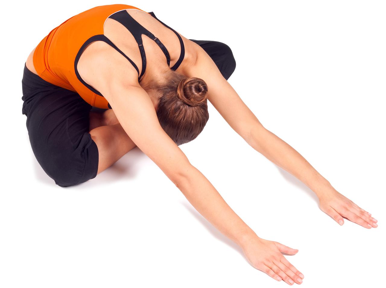 足裏を合わせて上半身を前に倒す合蹠(がっせき)のポーズも、お尻のコリを解消してくれる。