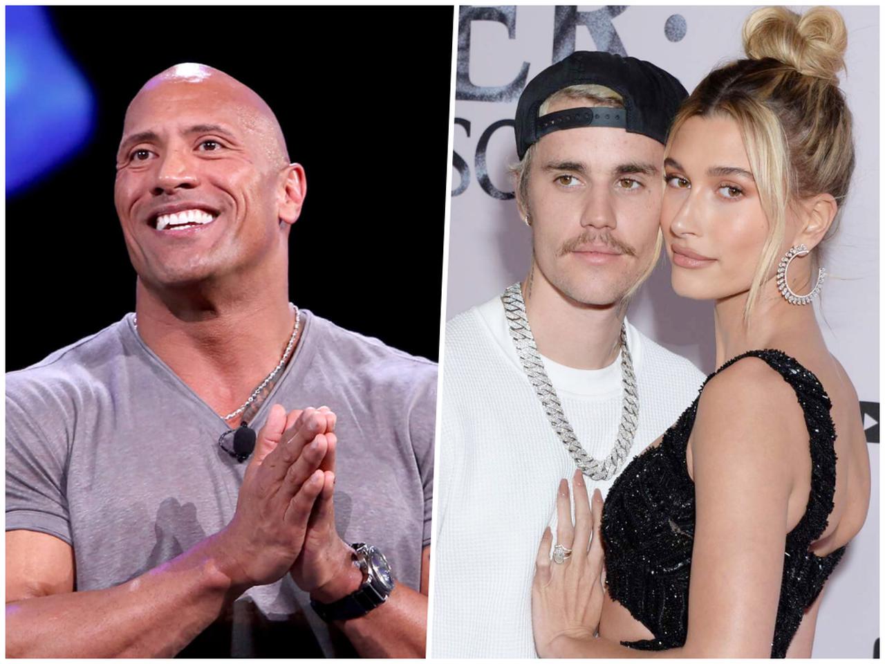 ドウェイン・ジョンソン(左)とジャスティン・ビーバー&ヘイリー・ビーバー夫妻(右)。