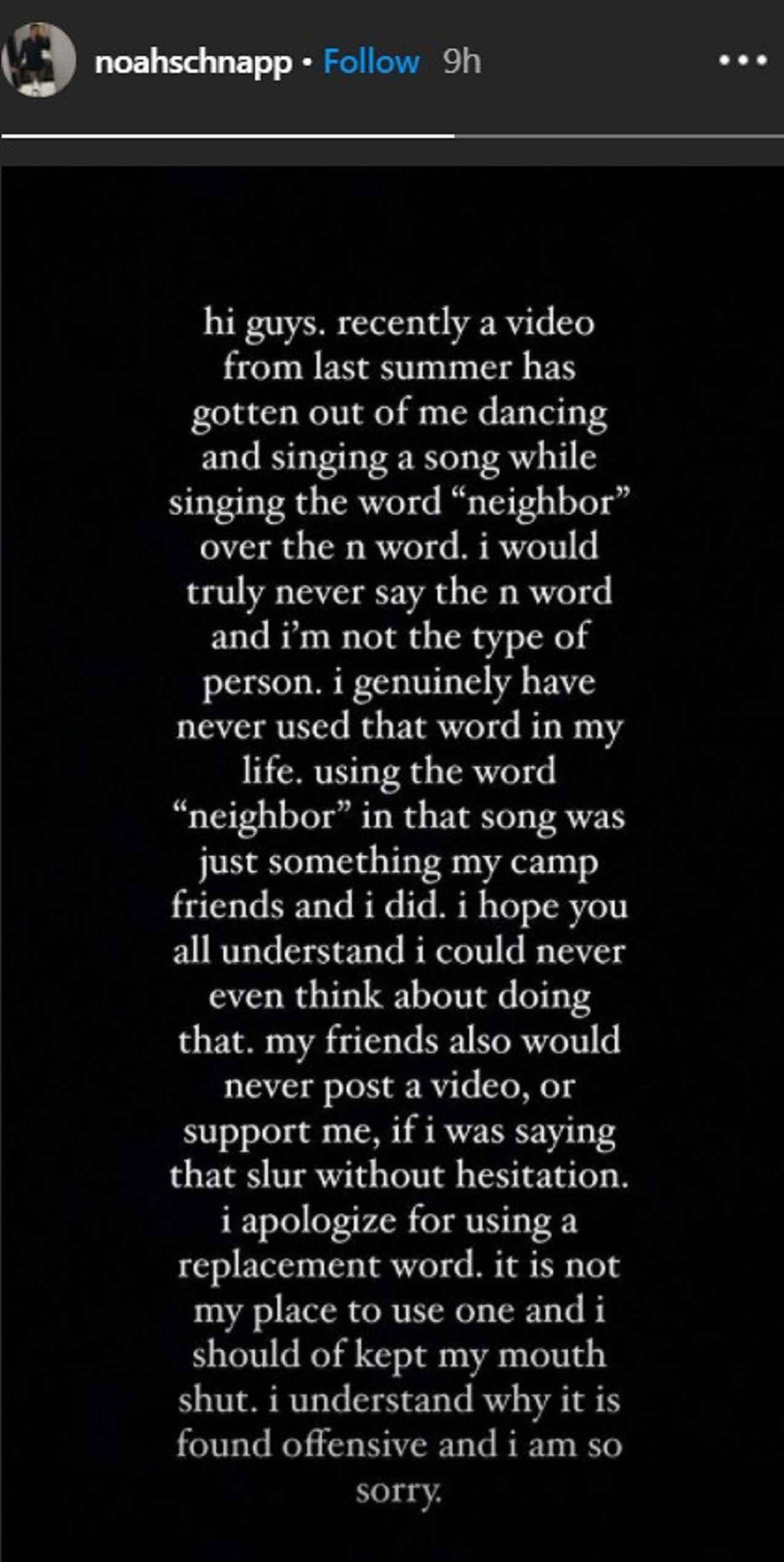 これを受け、世間からブーイングが殺到し、ツイッター上では「#NoahSchnappIsOverParty(ノア・シュナップは終わりだ)」といったノアのキャリアの“終了”を宣言するハッシュタグが頻用されるなか、ノア本人がインスタグラムストーリーを通じて釈明のコメントを発表した。