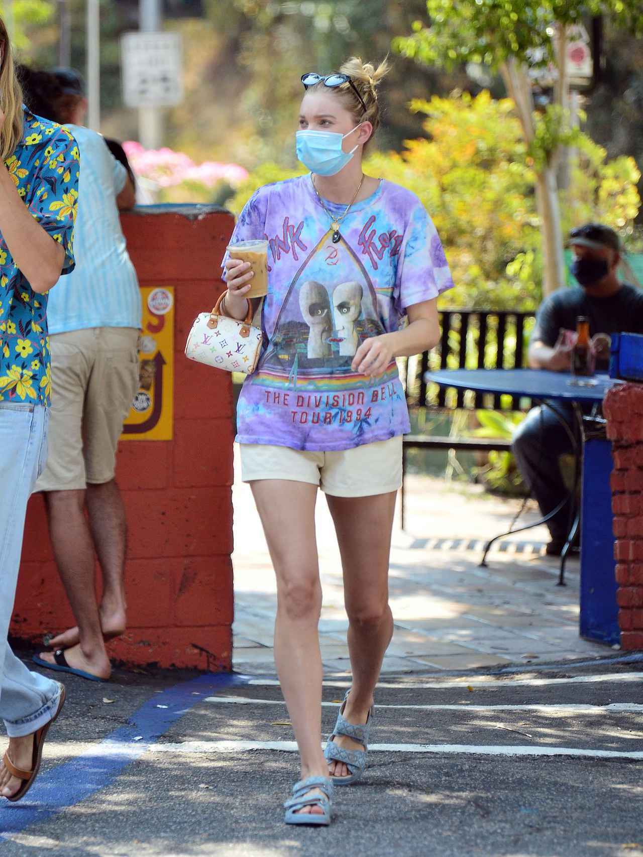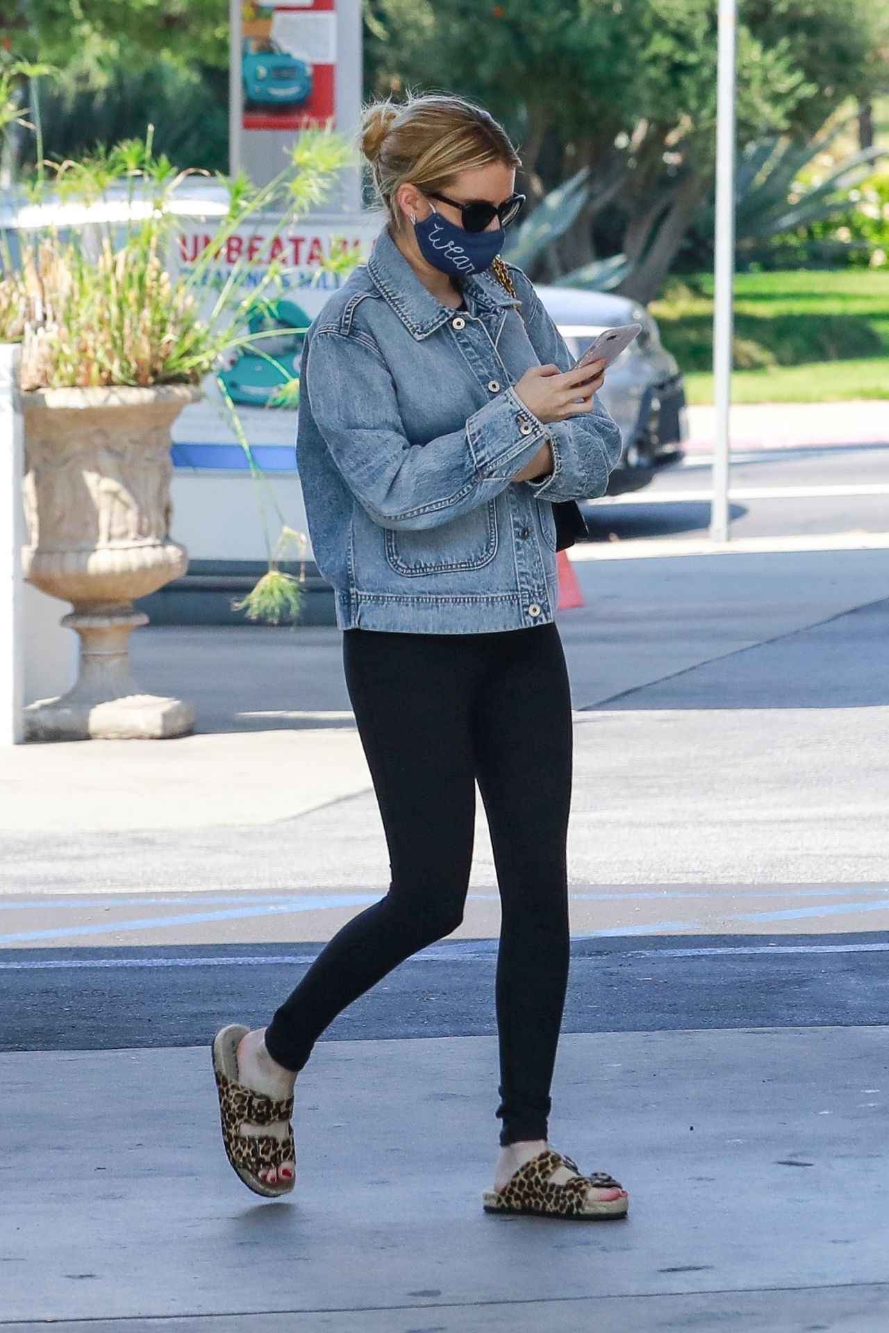 人気女優のエマ・ロバーツは、レギンスにGジャンを合わせたリラックススタイルの足元に、Manebi Dakotaのレオパードプリントがアクセントになったハイテクサンダルで旬な着こなしに。デニム調のマスクはAhida Correaleのもの。