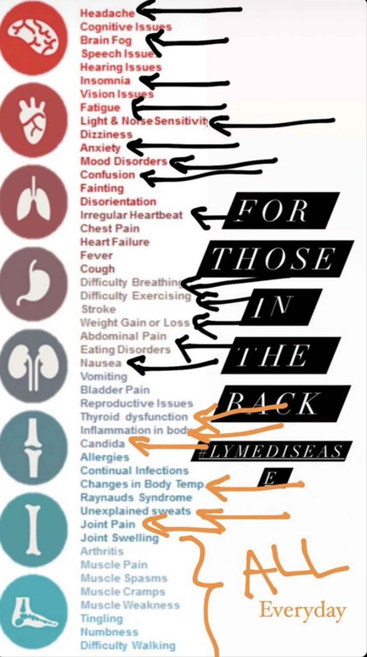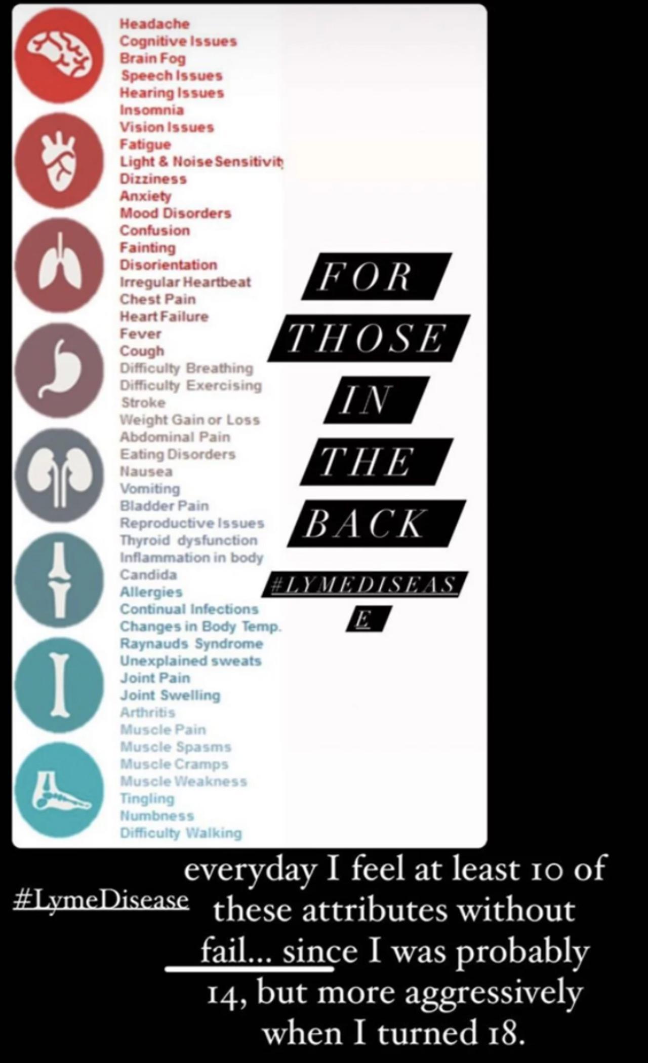 診断がつきにくいことから“Invisible Disease(見えない病)”と言われているライム病については、多くのセレブがその経験を語っており、レシピ本が大ヒットしたシェフのジョウディ・カラは、その症状をリスト化したイラストをインスタグラムでシェア。するとベラは、「真実。見えない病…。ジョウディ・カラ、愛してる」とコメントし、その中で自身の症状に当てはまるものをチェックして公開した。ベラが明かしたその症状は以下の通り。