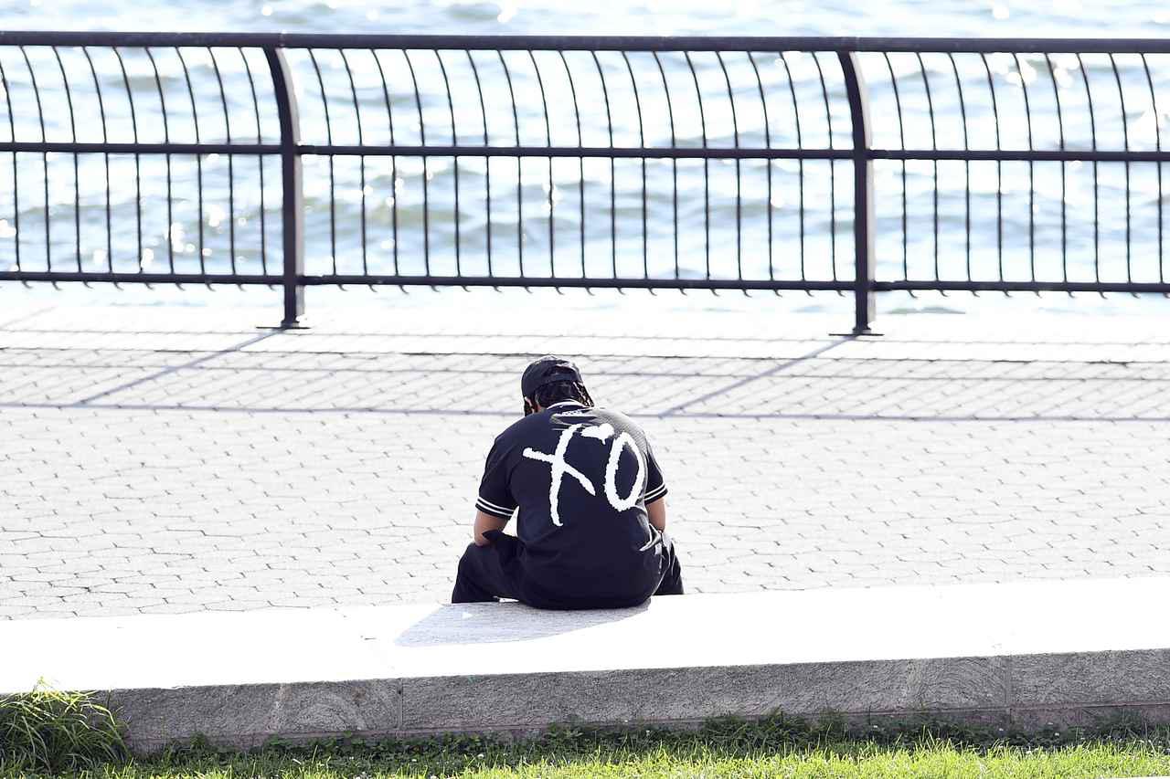 ハドソン川をぼーっと眺めながら、ひとりぼっちで腰かけるザ・ウィークエンド。哀愁漂ううしろ姿がなんともいえない。