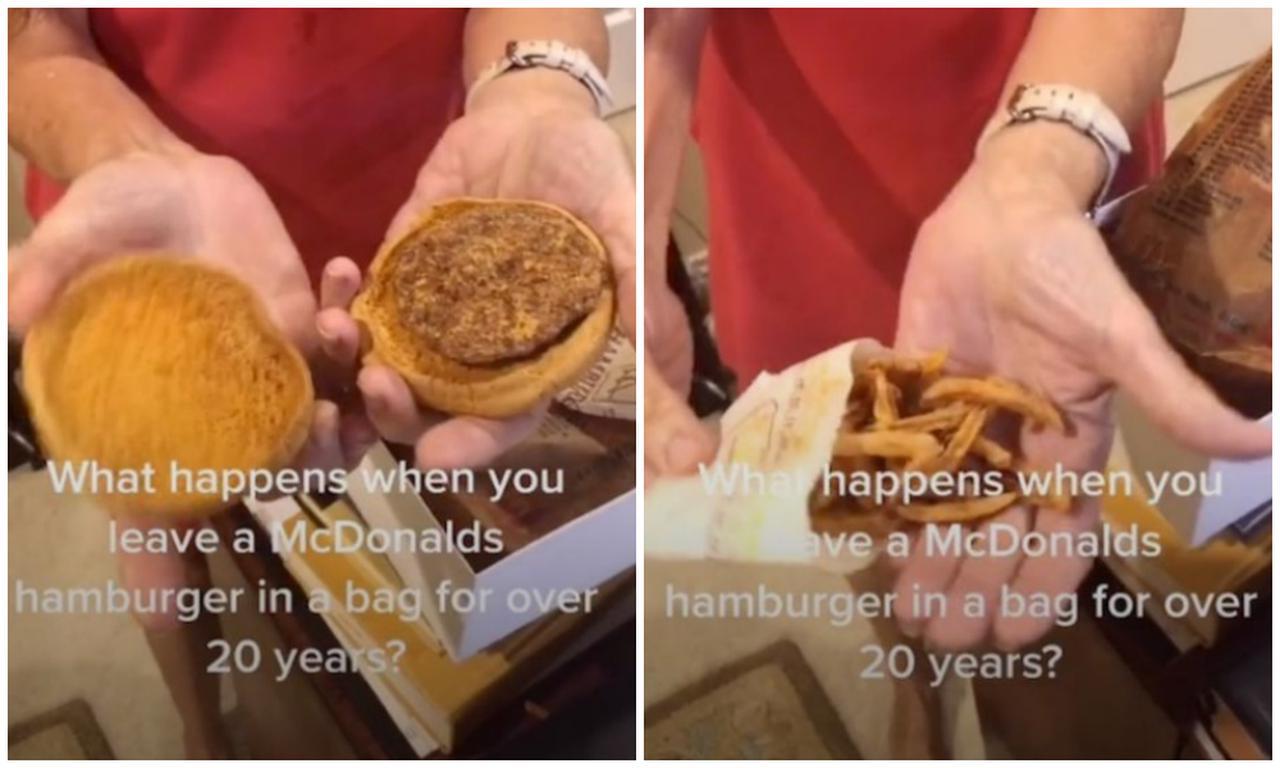 マクドナルドのハンバーガーとポテトは腐らない?ある女性がTikTokにアップした、24年前のハンバーガーとポテトの「現在の姿」に衝撃が走る。(フロントロウ編集部)