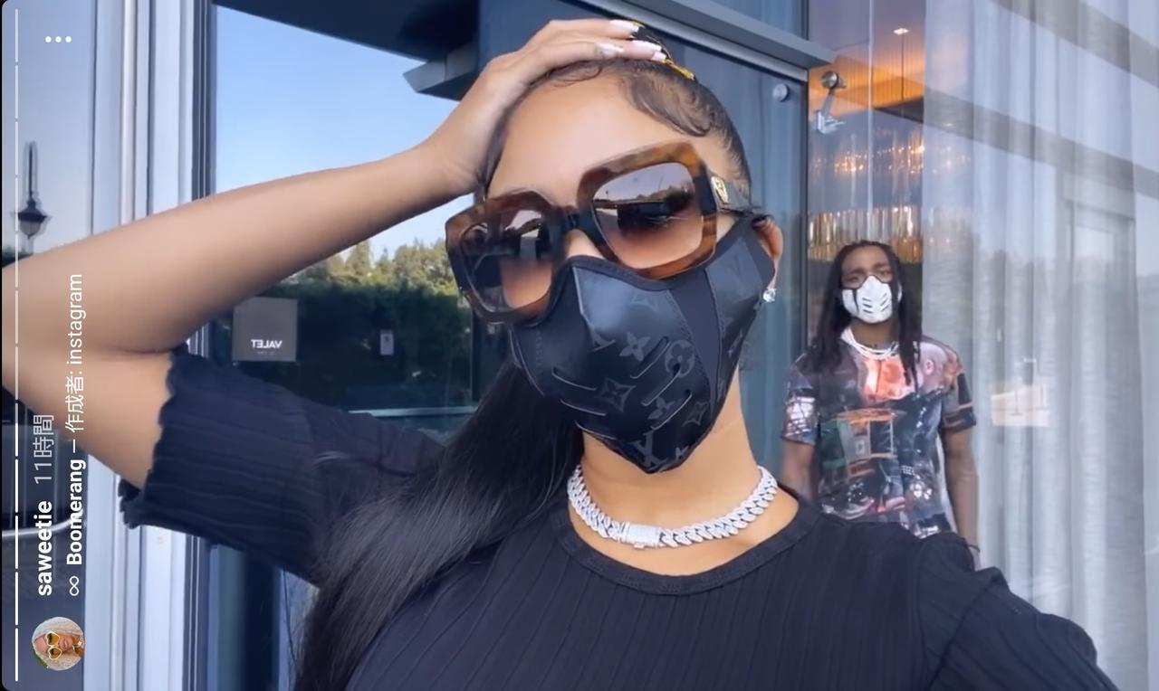 ミーゴスのクエヴォが、恋人で女性ラッパーのスウィーティーとともにお出かけ。その際2人がつけていたのは、ルイ・ヴィトン(Louis Vuitton)のモノグラムがデザインされたマスクだった。(フロントロウ編集部)