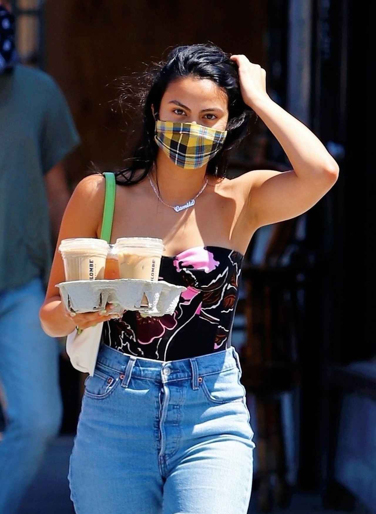 ドラマ『リバーデイル』のカミラ・メンデスはイエローのタータンチェック・マスクを愛用。